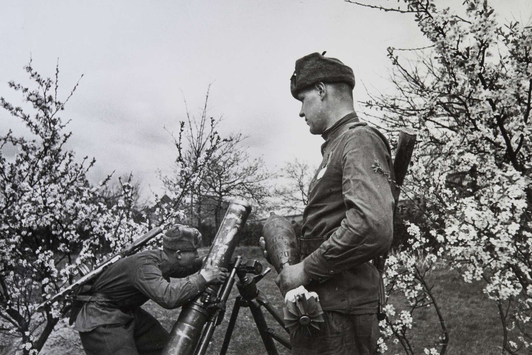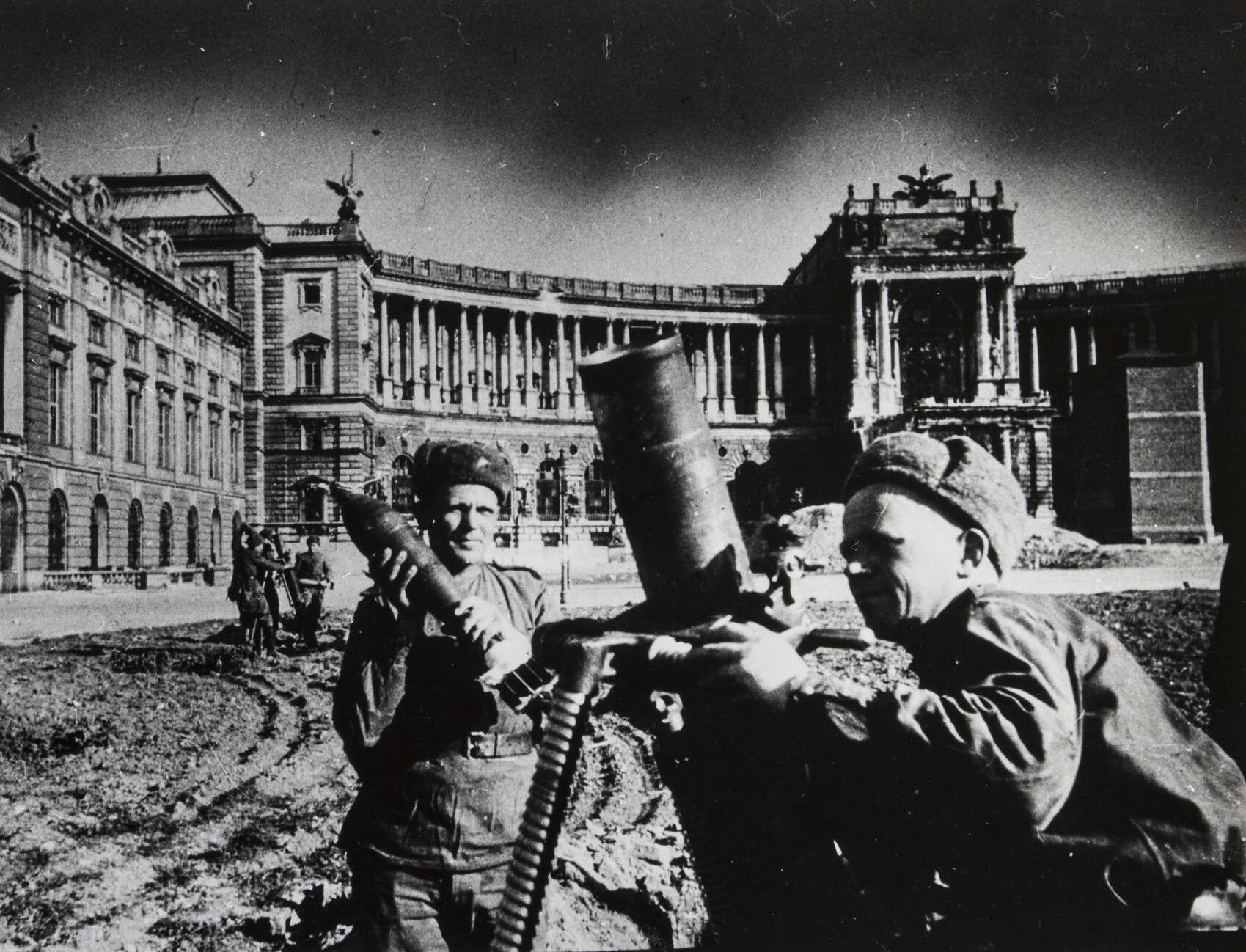 Советские минометчики с полковым минометом у зимнего дворца Хофбургов в Вене