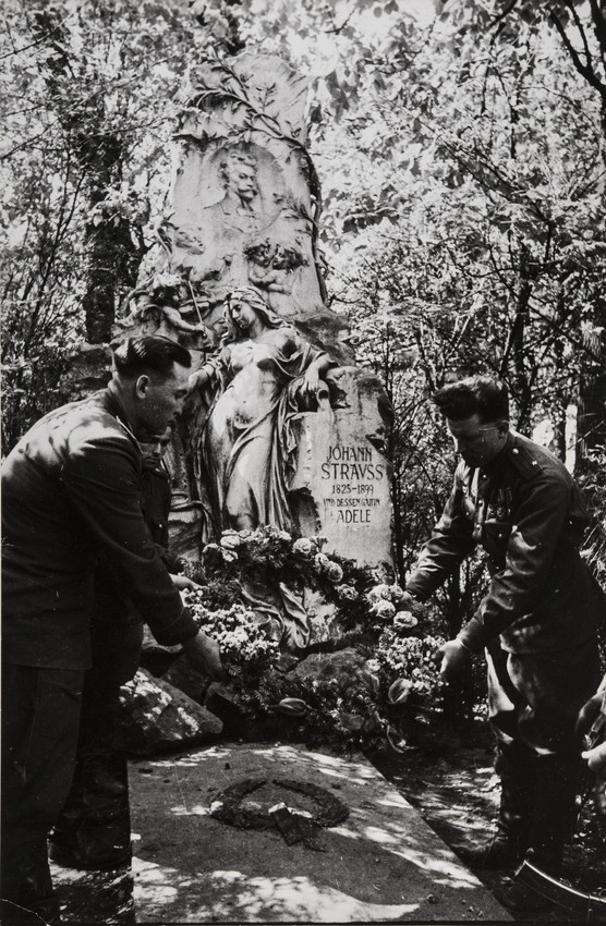 Советские солдаты возлагают цветы на могилу немецкого композитора Иоганна Штрауса