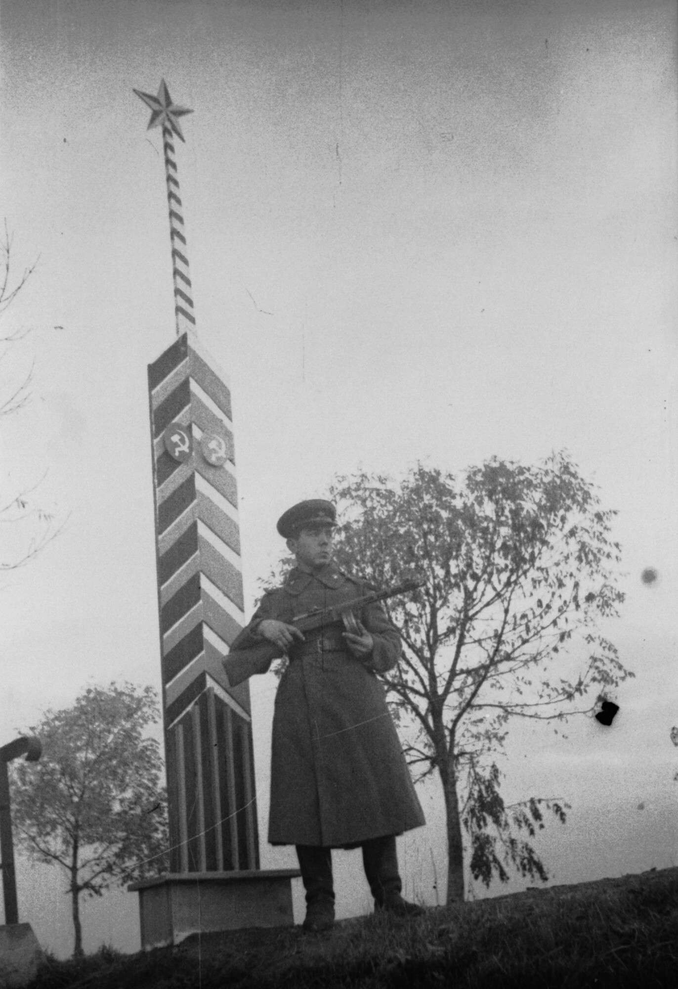 Часовой С.Ф. Ивлев у пограничного столба, отделяющего СССР от Восточной Пруссии