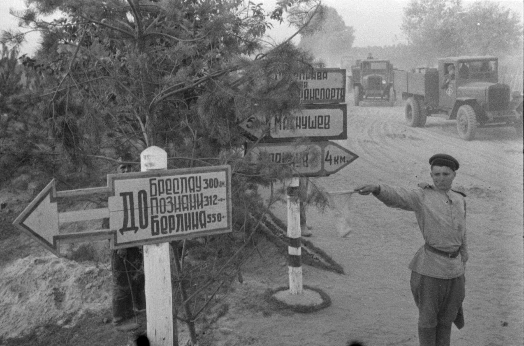 Боец-регулировщик регулирует движение; вид указателей у дороги