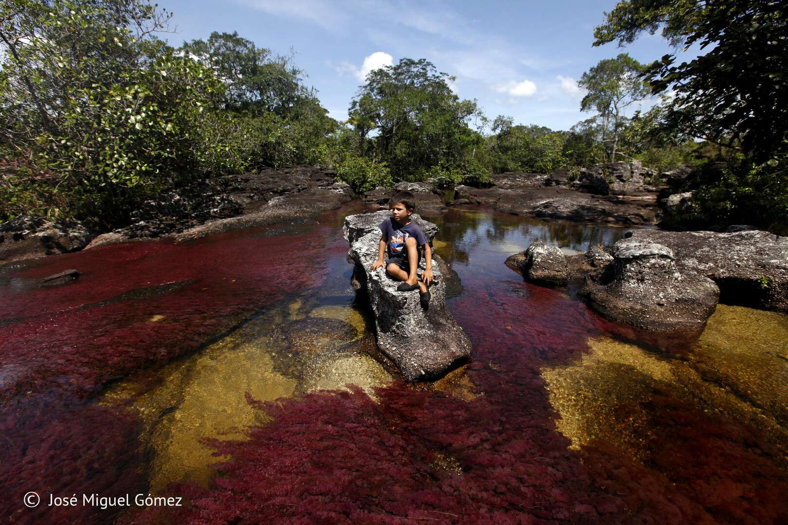 Niño en medio del Caño Cristales o del río de los cinco colores