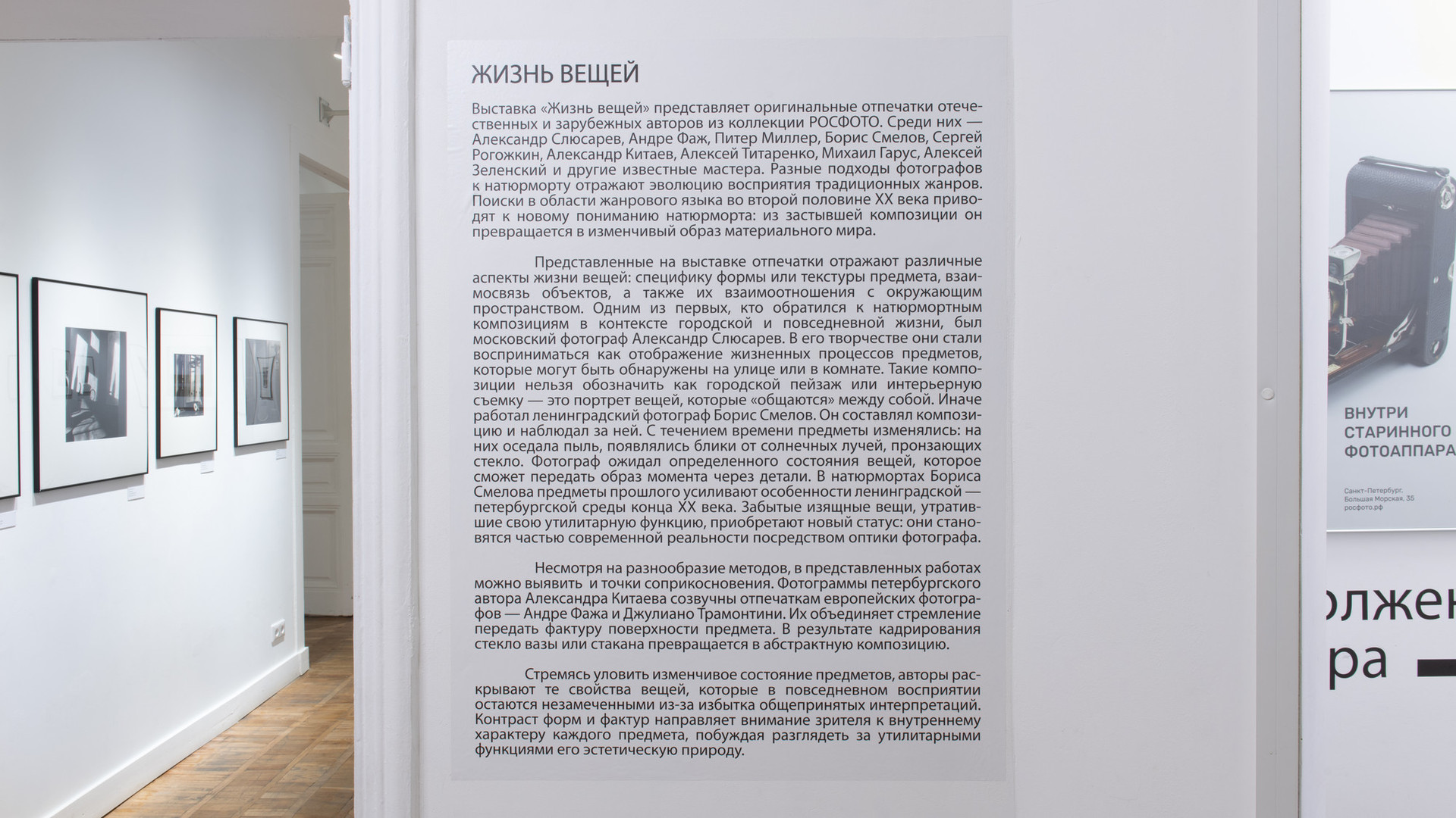 Выставка «Жизнь вещей» представляет оригинальные отпечатки отечественных и зарубежных авторов из коллекции РОСФОТО. Среди них — Александр Слюсарев, Андре Фаж, Питер Миллер, Борис Смелов, Сергей Рогожкин, Александр Китаев, Алексей Титаренко, Михаил Гарус, Алексей Зеленский и другие известные мастера. Поиски в области жанрового языка во второй половине ХХ века приводят к новому пониманию натюрморта: из застывшей композиции он превращается в изменчивый образ материального мира.