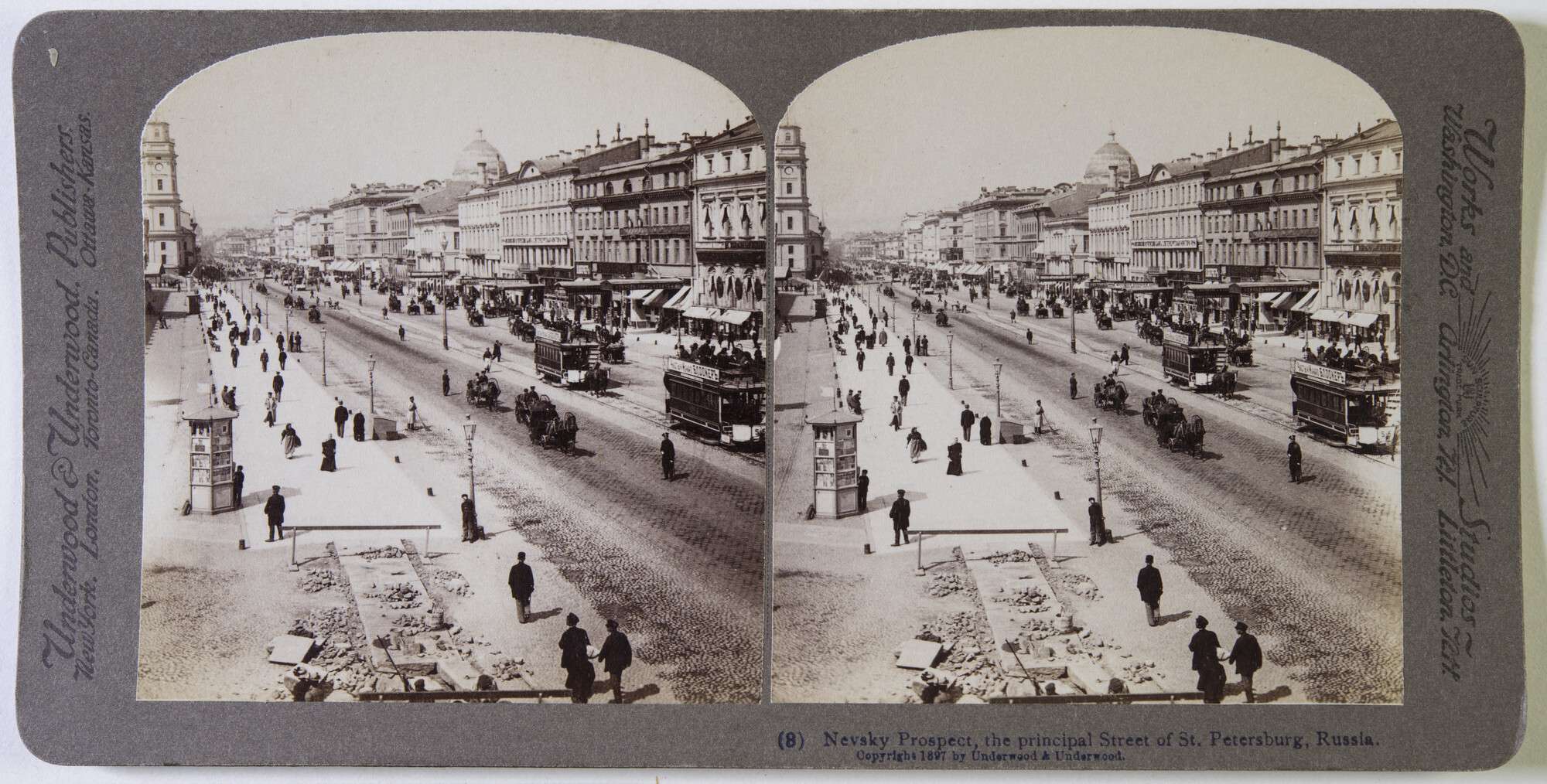 This selection includes stereoviews of Saint Petersburg from the 1890s to the early 1910s from the ROSPHOTO collection. The stereoscopic images were created by the St. Petersburg photographer Mechislav Belyavsky and the American publisher Underwood & Underwood. Belyavsky produced several series of stereophotographs and was one of the few photographers granted permission to photograph and publish stereoscopic images of the interior views of the Imperial Hermitage.