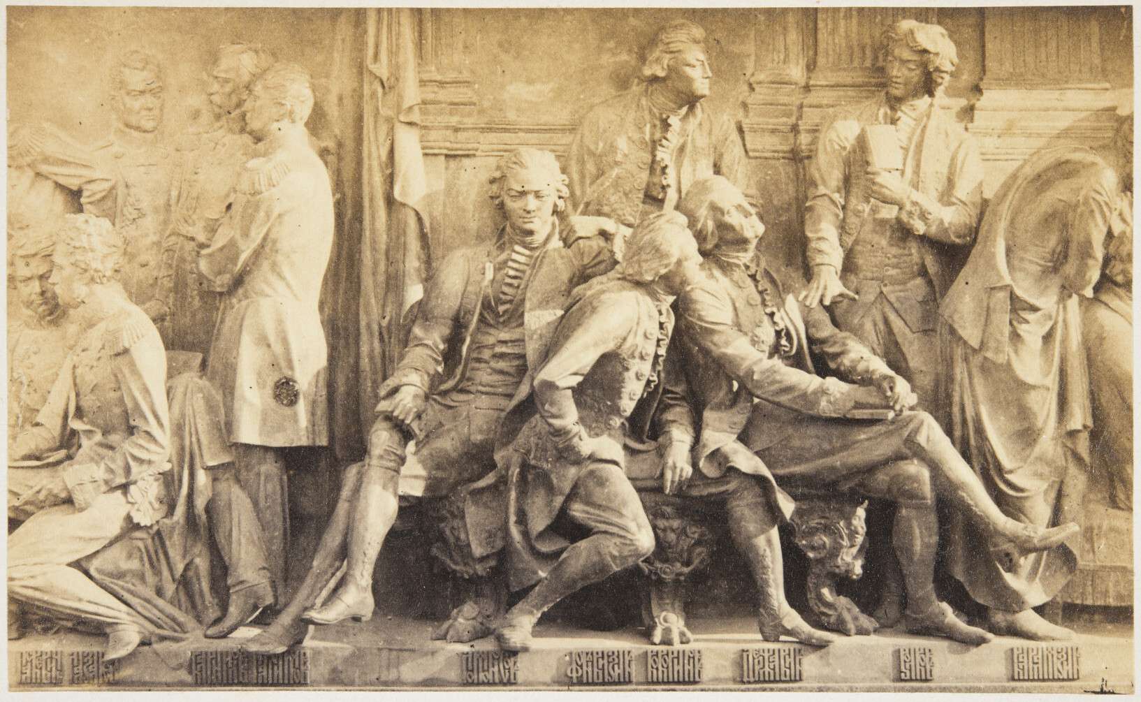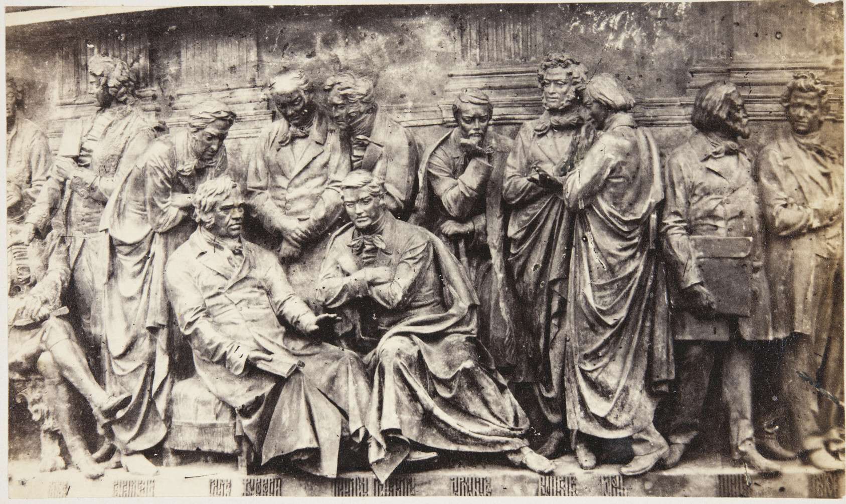 Гавриил Державин; Федор Волков; Николай Карамзин — за спиной Ивана Крылова, рядом с которым Александр Грибоедов (сидят); за спиной Грибоедова — Василий Жуковский и Николай Гнедич; Михаил Лермонтов (опирается подбородком на руку); Александр Пушкин; Николай Гоголь; Михаил Глинка; Карл Брюллов.