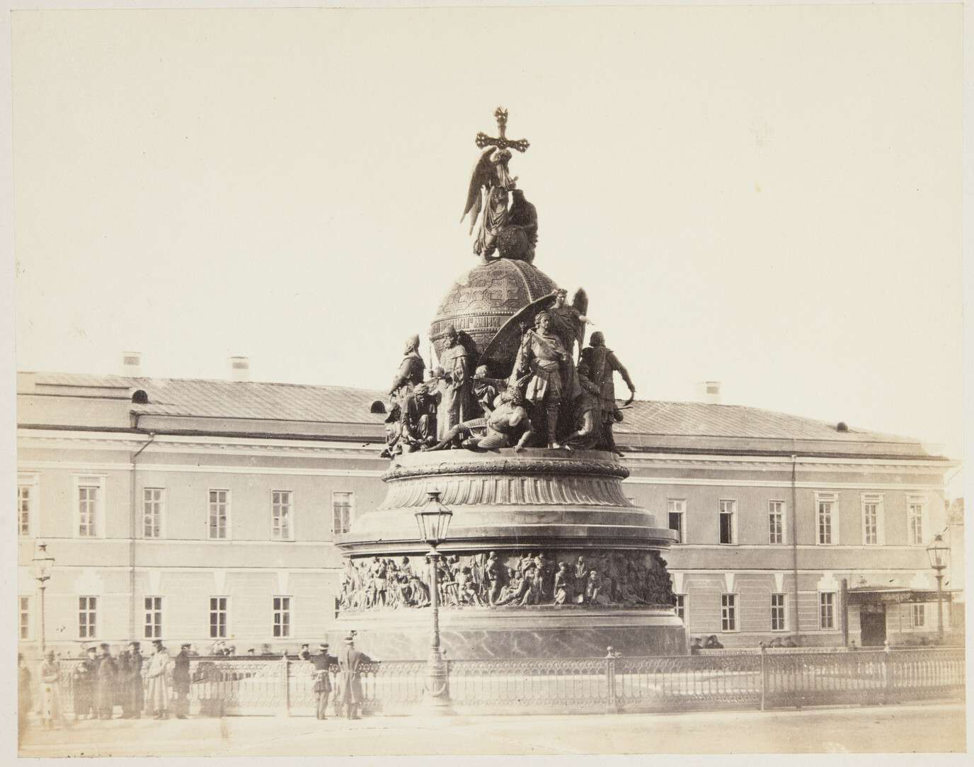 Памятник «Тысячелетие России» находится в Новгородском кремле (Детинце) — одном из древнейших памятников военно-оборонительного зодчества России XV–XVII веков. Авторы проекта памятника — скульпторы М. О. Микешин (1835–1896) и И. Н. Шредер (1835—1908). Выполнен в неовизантийском стиле. Памятник отражает историю государства российского с IX по XIX век. 128 представленных фигур — государственные деятели, военные, просветители, писатели и художники, значимые для истории России, композиционно делятся на три уровня. Венчает композицию группа из двух фигур — ангела, поддерживающего крест, и коленопреклоненной женщины, которые олицетворяют православную церковь и Россию; Среднюю часть памятника занимают 17 фигур группирующиеся в шесть скульптурных групп вокруг шара-державы, символизирующих различные периоды истории Русского государства. Горельефы 109 исторических деятелей помещены на фриз в нижней части монумента. «В 1857 году в рамках подготовки к празднованию 1000-летия Российской государственности по постановлению Комитета Министров был объявлен конкурс на лучший проект памятника, который планировалось поставить в Новгороде, куда по легенде и были призваны варяги. Выбор Новгорода как центра столь важного государственного праздника не был однозначным. Ведь на протяжении нескольких веков Новгород ассоциировался с вече и республиканскими ценностями. Однако Александр II лично поддержал идею проведения праздника в Новгороде, ведь державность, по мнению Императора-реформатора, не противоречила гражданским свободам».