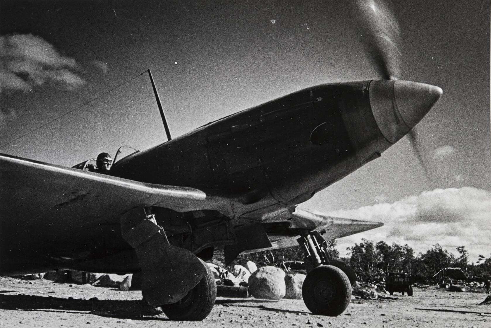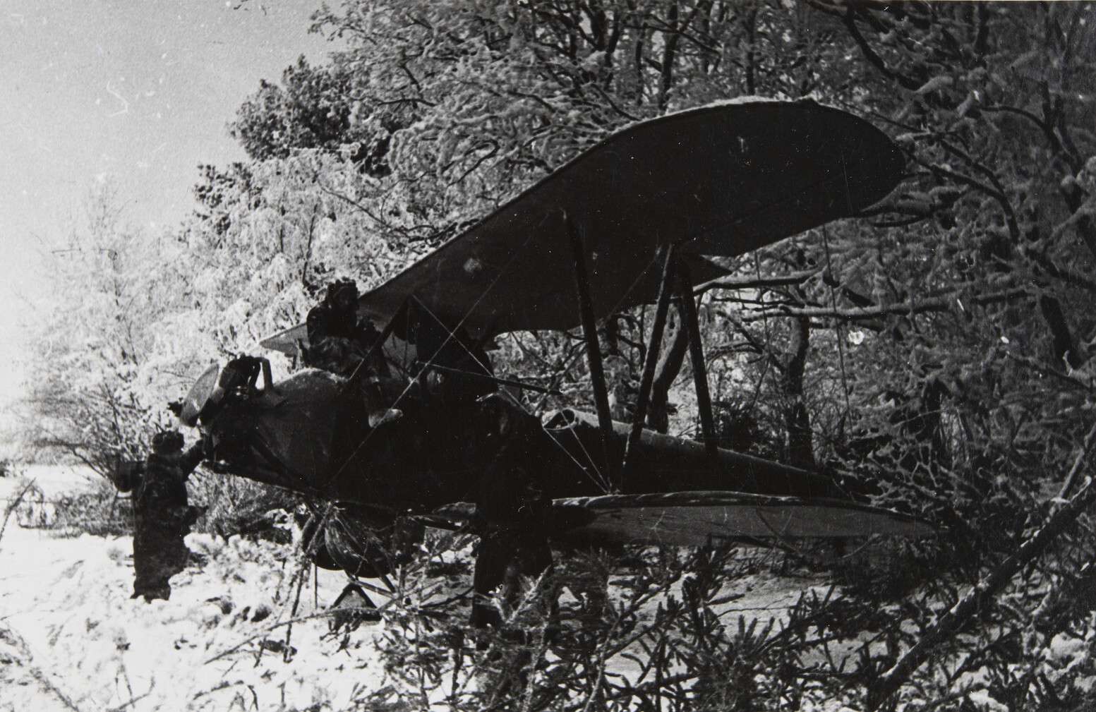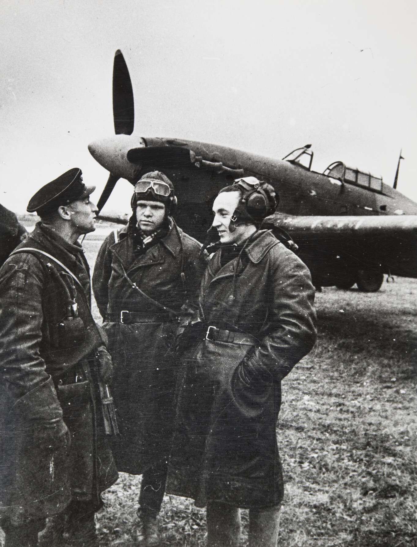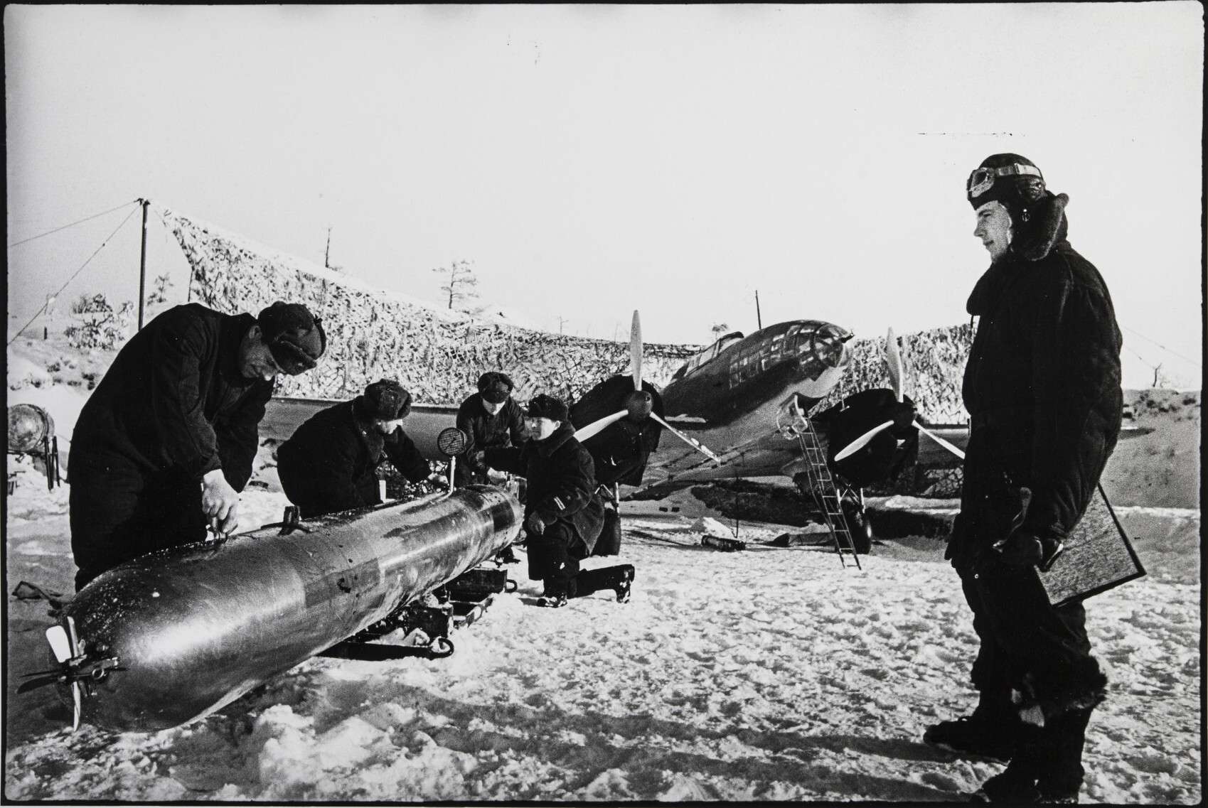 Сержант П. А. Сизов и младший сержант П. И. Иванов, пд руководством воетехника 2-го ранга Н. Д. Петрищева готовят самолет к вылету
