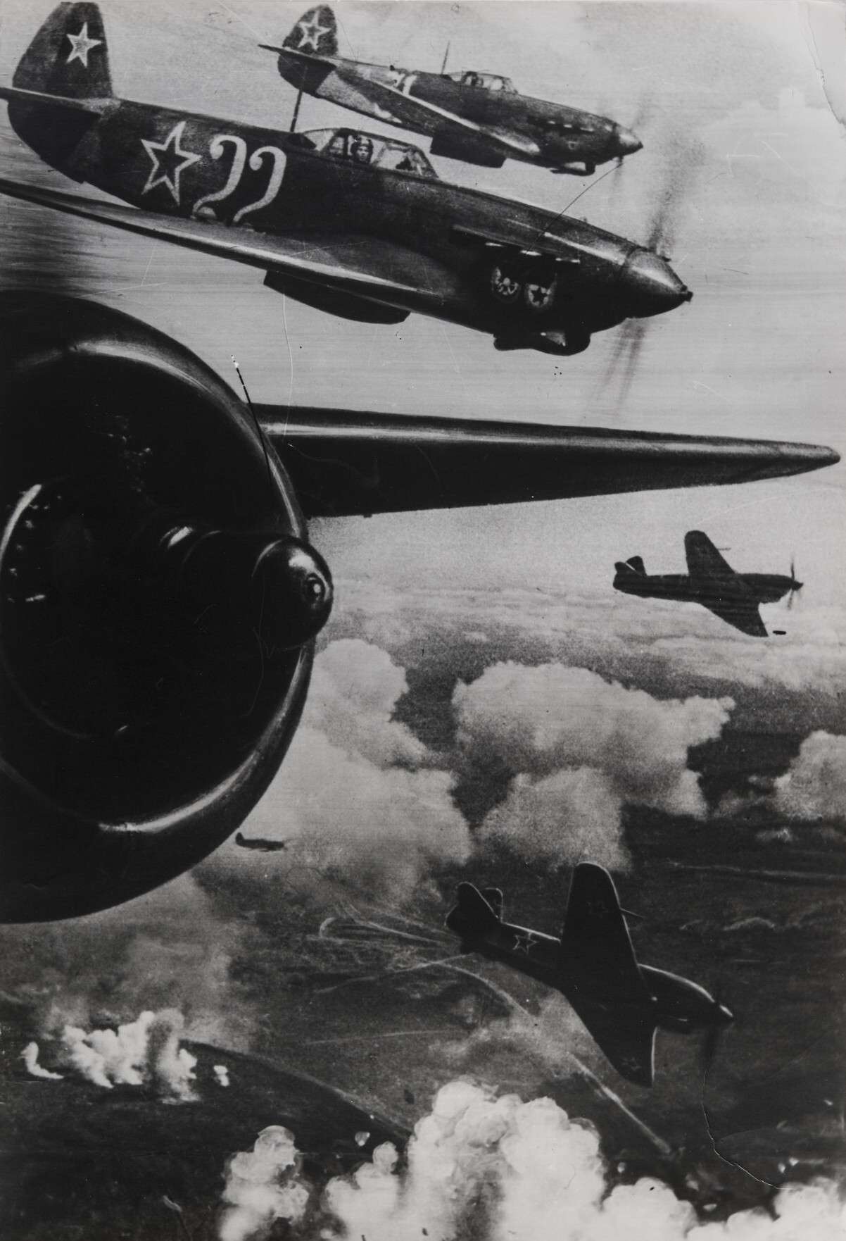 Фотоколлаж «Над Сапун-горой». Самолеты 6-го гвардейского истребительного авиаполка сопровождают бомбардировщик типа А-20