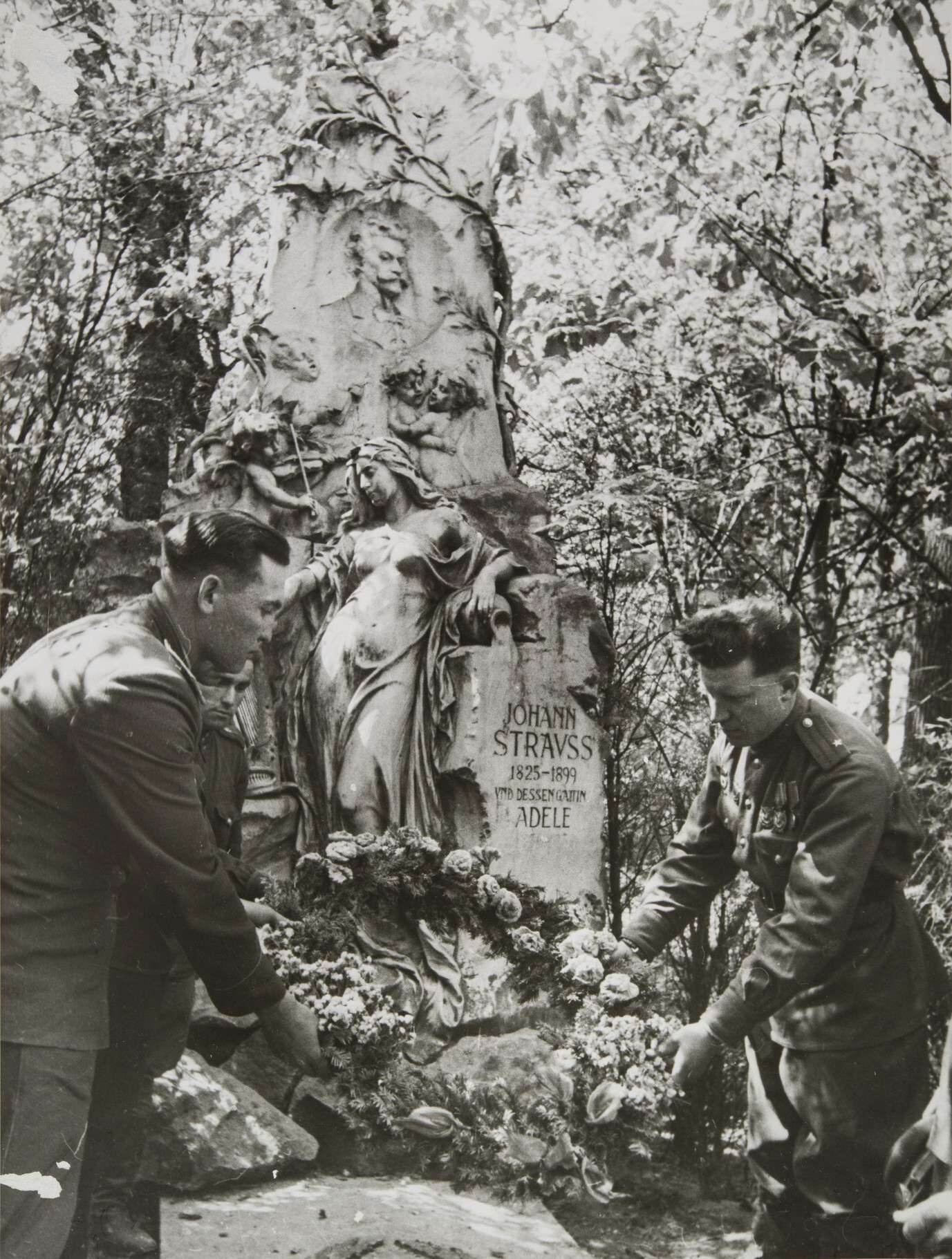 Советские солдаты возлагают цветы на могилу австрийского композитора Иоганна Штрауса