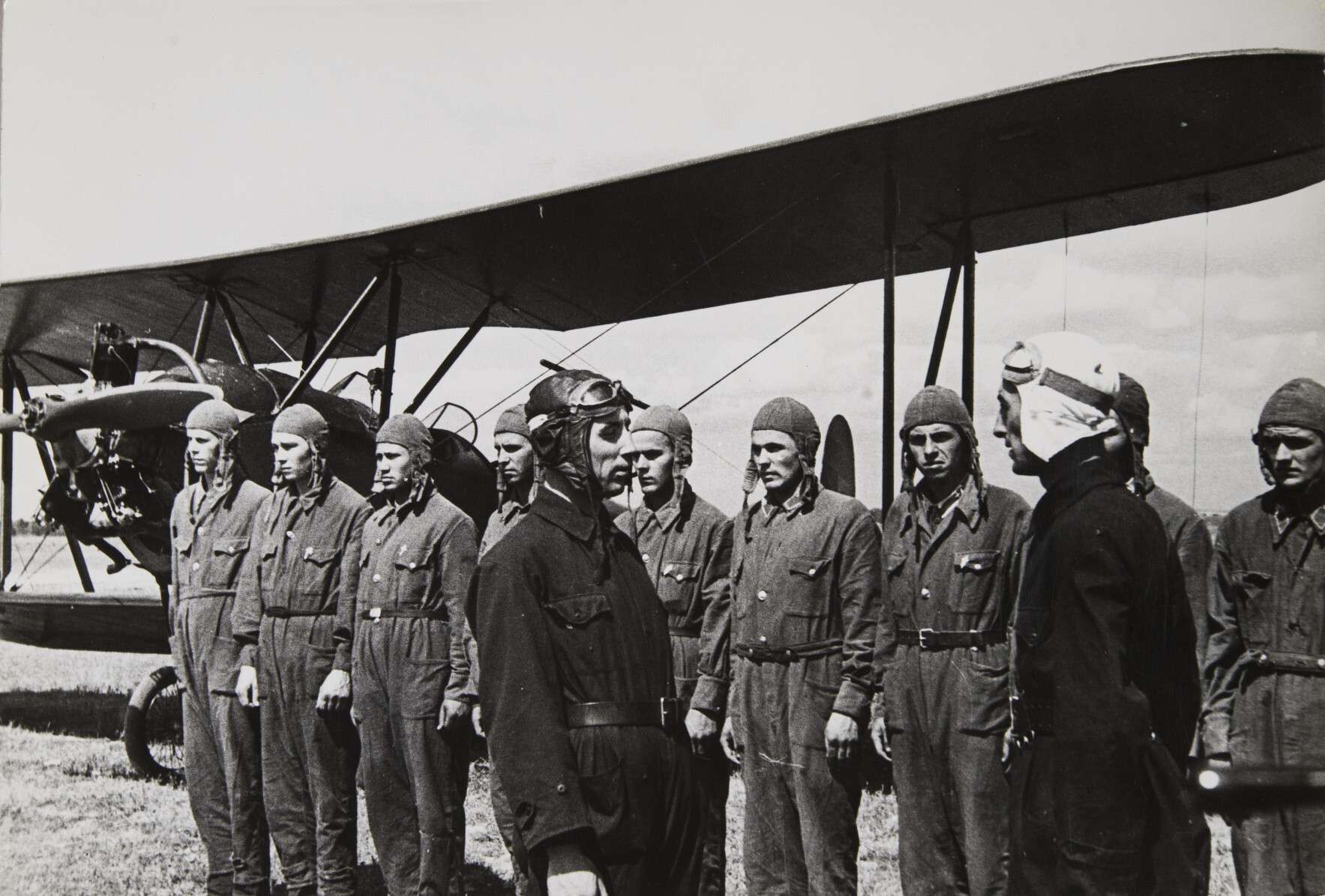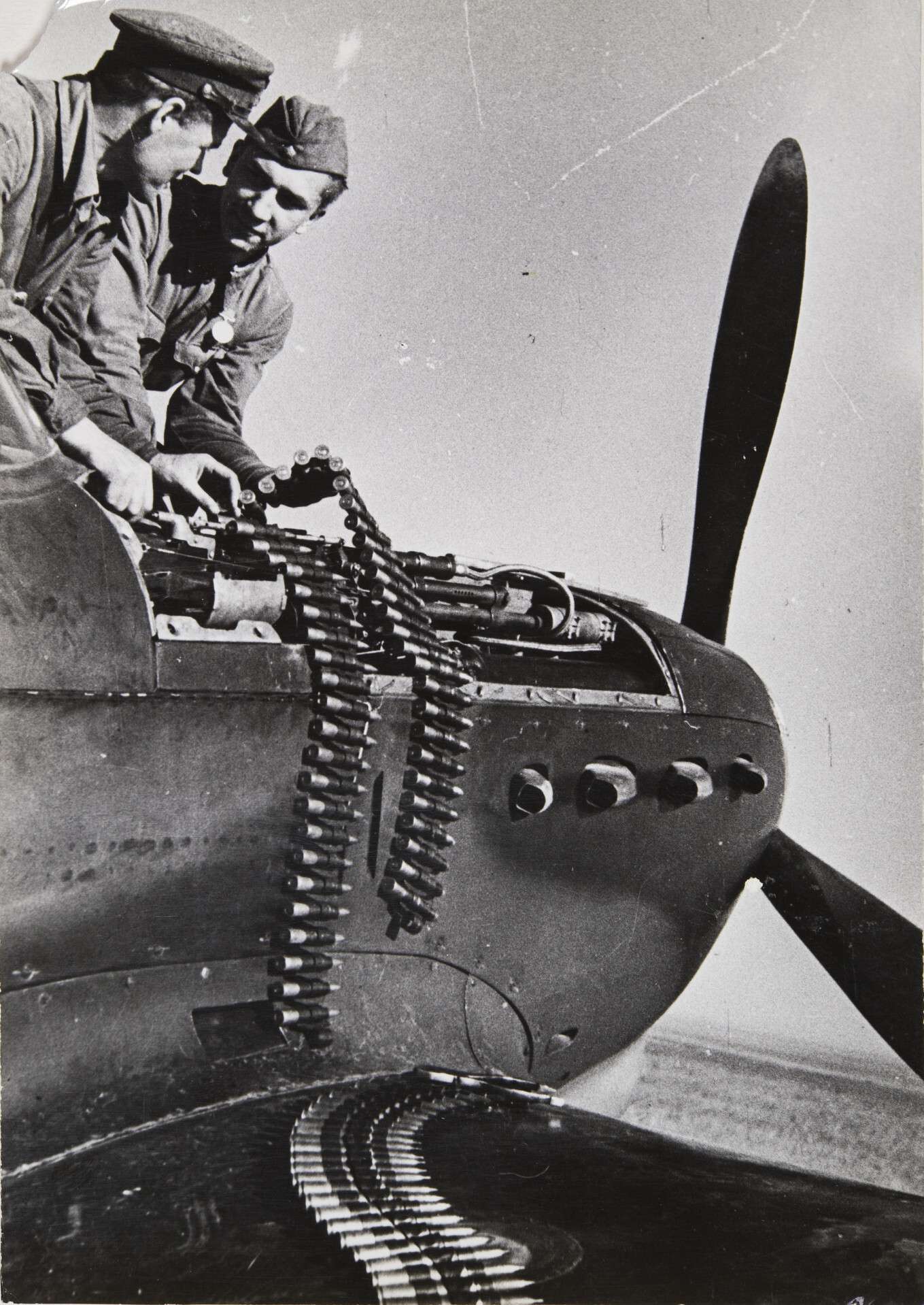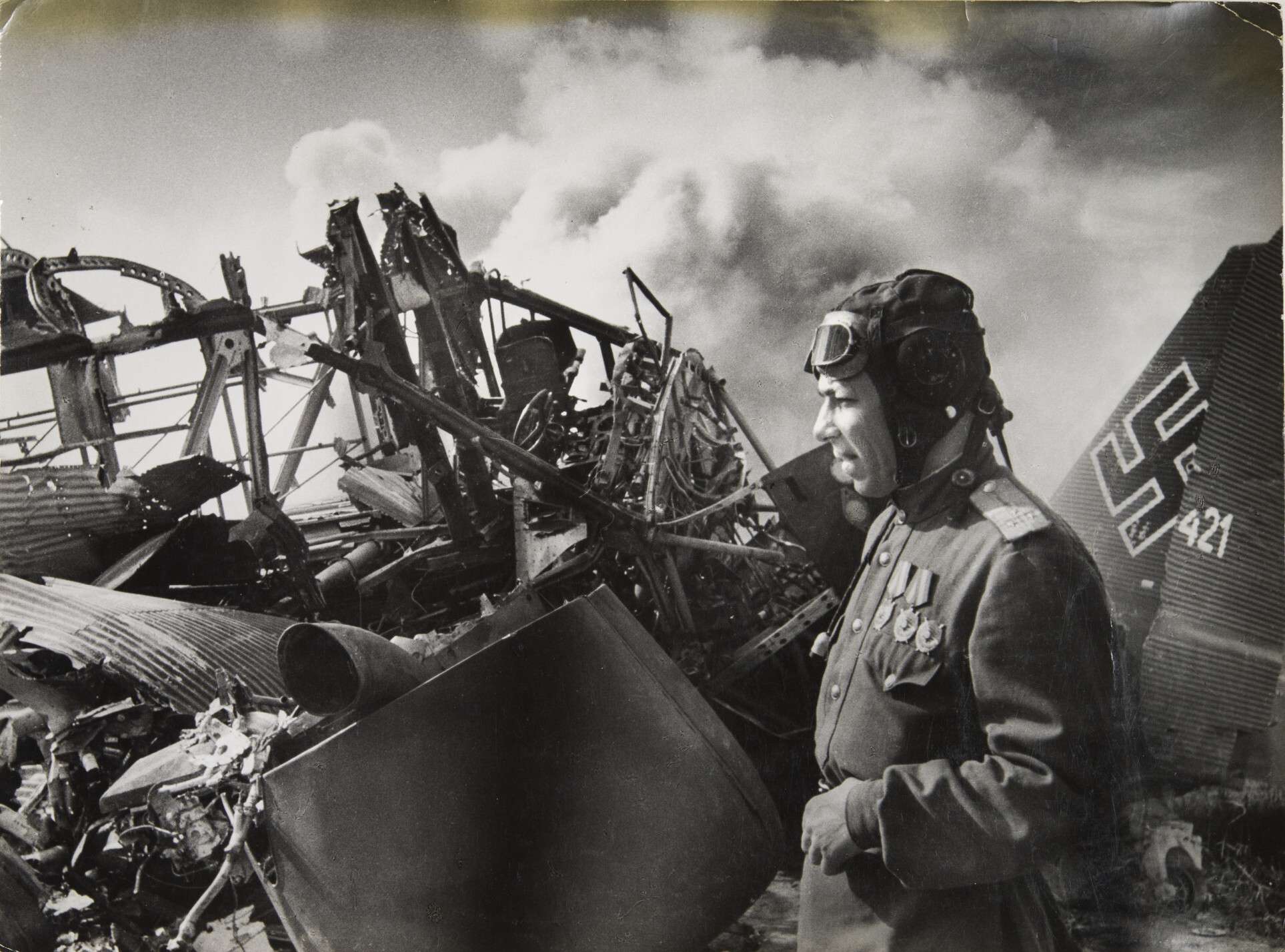 Советский летчик капитан Н. Киселев у девятого сбитого им самолета врага