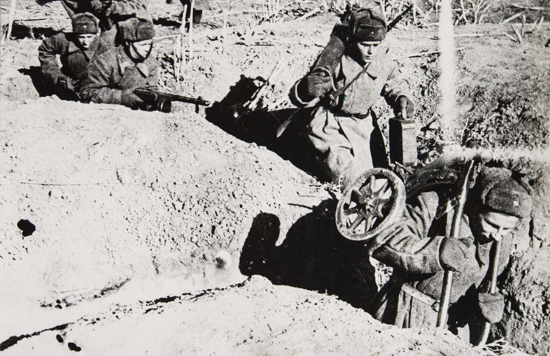 Пулеметчик В. Ф. Ренго поддерживает огнем продвижение своего отделения