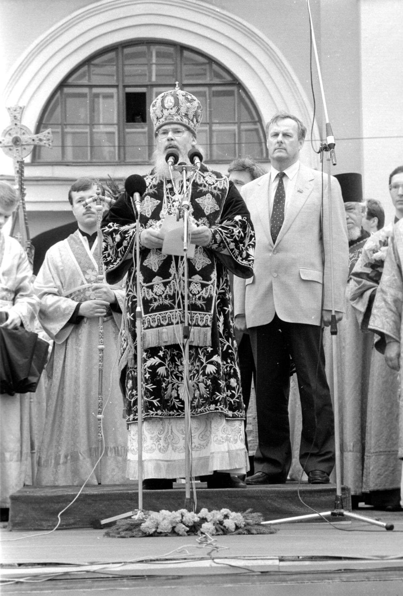 Патриарх Московский и всея Руси Алексий II и Анатолий Собчак во время митинга и службы у восстанавливаемой церкви Святого Благоверного князя Александра Невского. Усть-Ижора, 14 июля 1990 ©РОСФОТО