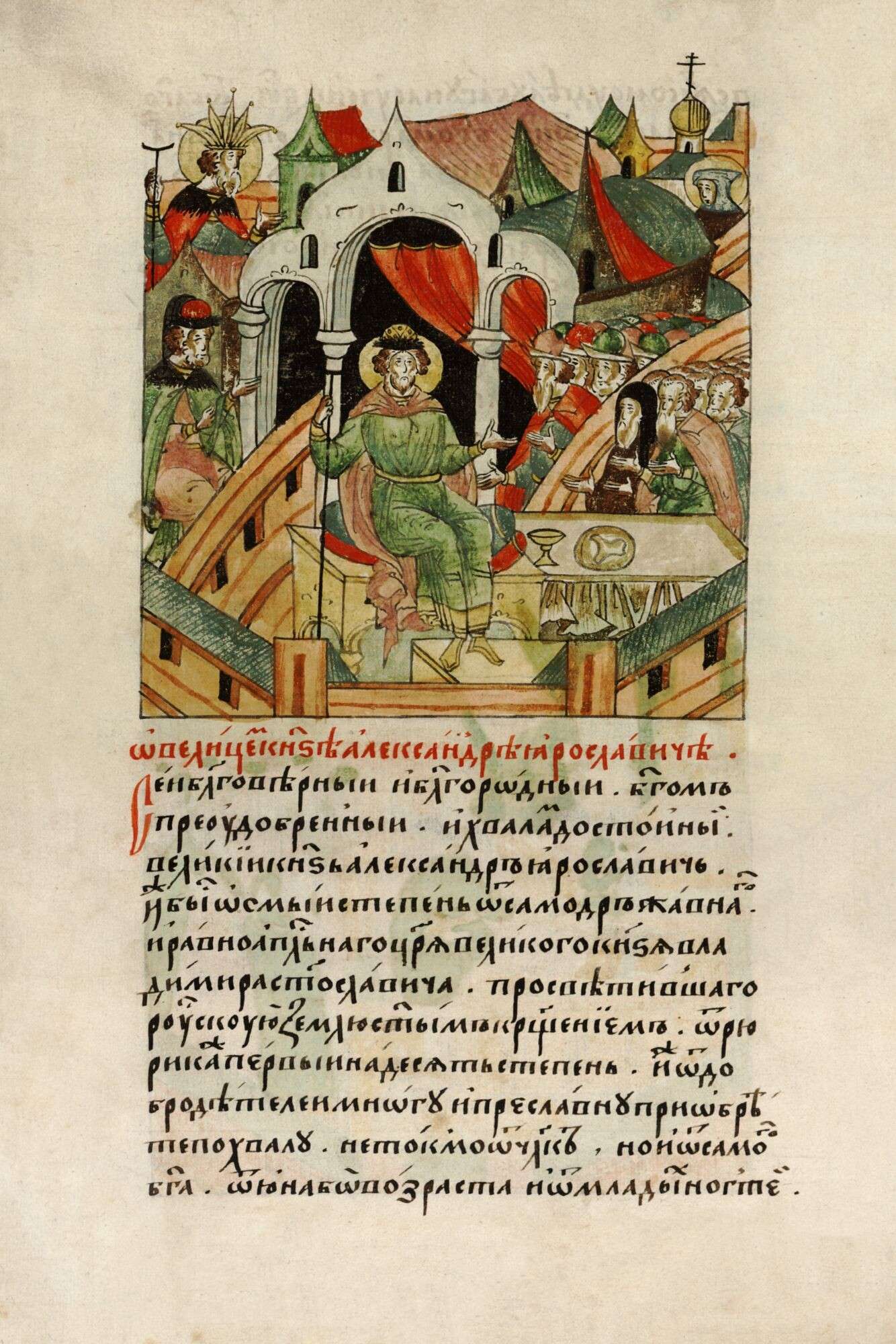 Канонизированный Русской православной церковью в 1547 году, Александр Невский стал четвертым причисленным к лику святых представителем Дома Рюриковичей после крестителя Руси великого князя Киевского Владимира и его убиенных сыновей Бориса и Глеба.На миниатюре Александр изображен со своим пращуром и родителями.Его отец Ярослав Всеволодович был сыном великого князя владимирского Всеволода Большое Гнездо и правил до монгольского завоевания в Переяславле-Залесском. В 1234 году, будучи по совместительству еще и новгородским князем, одержал победу над рыцарями ордена меченосцев в битве на реке Омовже (Эмайыге – современная Эстония). В 1243 году с разрешения Батыя стал великим князем владимирским.Умер в 1246 году, возвращаясь из монгольской столицы Каракорума, где, предположительно был отправлен.Мать Александра Невского Феодосия была дочерью известного своими полководческими способностями князя Мстислава Удатного. В 1244 году незадолго до смерти приняла монашество под именем Ефросиньи.