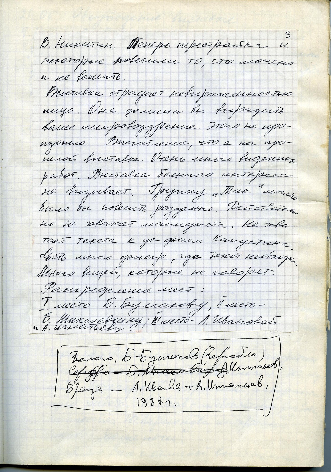 В. Никитин Теперь перестройка и некоторые повесили то, что можно и не вешать. Выставка страдает невыраженностью лица. Она должна бы выражать Ваше мировоззрение. Итого не произошло. Впечатление, что я на прошлой выставке. Очень много виденных работ. Выставка большого интереса не вызывает. Группу «Так» можно было бы повесить раздельно. Действительно, не хватает манифеста. Не хватает текста к фотографиям Капустина. Есть много фотографий, где текст необходим. Много вещей, которые не говорят.