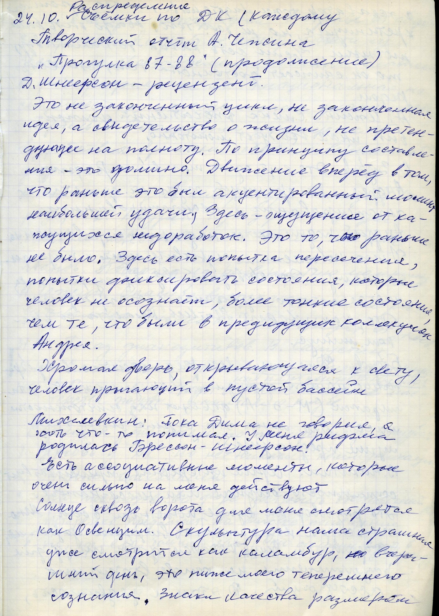 Есть ассоциативные моменты, которые очень сильно на меня действуют Солнце сквозь ворота для меня смотрится как Освенцим. Скульптура наша страшная уже смотрится как каламбур , вчерашний день, это ниже моего теперешнего сознания. Знаки качества размером экскаватор тоже свидетельства нашего прошло го кретинизма, но не боле того. Надо быть более точным. Если есть какой-то каламбур, то они снижает достоинства того, что есть рядом. А. Чежин: Сиена впечатлений должна быть, иначе все будет монотонно. В. Зубов: Это еще один шаг в биографии Андрея. За границей художник делятся на ангажированный и неангажированных. Андрей поднимется над ангажированностью. У него повышенная чувствительность к парадоксальному. Это свободный взгляд художника, чистая жестко сделанная фотография. Это, как говорит Матвеев, красота со знаком минус. Бобров: Для меня весь ряд ложится в изображение нашего дубизма. Народ молчит. Эти миражи (М-Э-Л) довлеют над ничтожностью масс. Для меня эта серия читается лучше предыдущей. В. Никитин: Серия интересная, присутствует социальность осознанная или неосознанная. Это разговор на языке, понятном всем. Многие кадры напоминают виденные фрагменты фильмов. Вещь, которая дает пищу для размышления на основе вторичных ассоциаций. В этом и уязвимость., так как каждая фотография в отрыве от общего теряется. Андрей демонстрирует эстетику своего слоя, своего времени, а самое главное в фотографиях не их эмоциональная насыщенность, а их социальная значимость. В. Бертельс: Фотография защищена от воздействия времени своей совершенной формой. В. Никитин: Здесь литература вылезла вперед, так как Андрей продукт социума. Наиболее повествователе Стали на даче. Иванов: Серия похожа на развернутую молекулу. А. Чежин: Спасибо выступающим. Я рассчитывал на большее количество отрицательных отзывов.