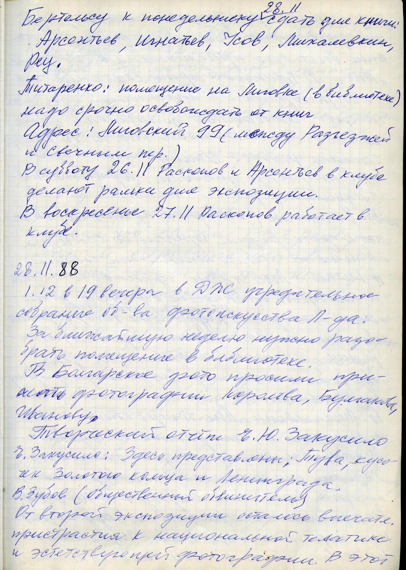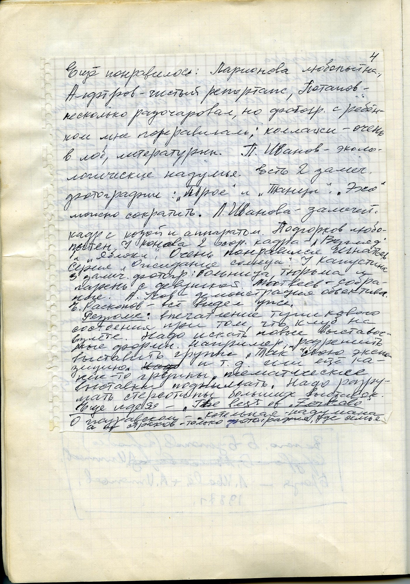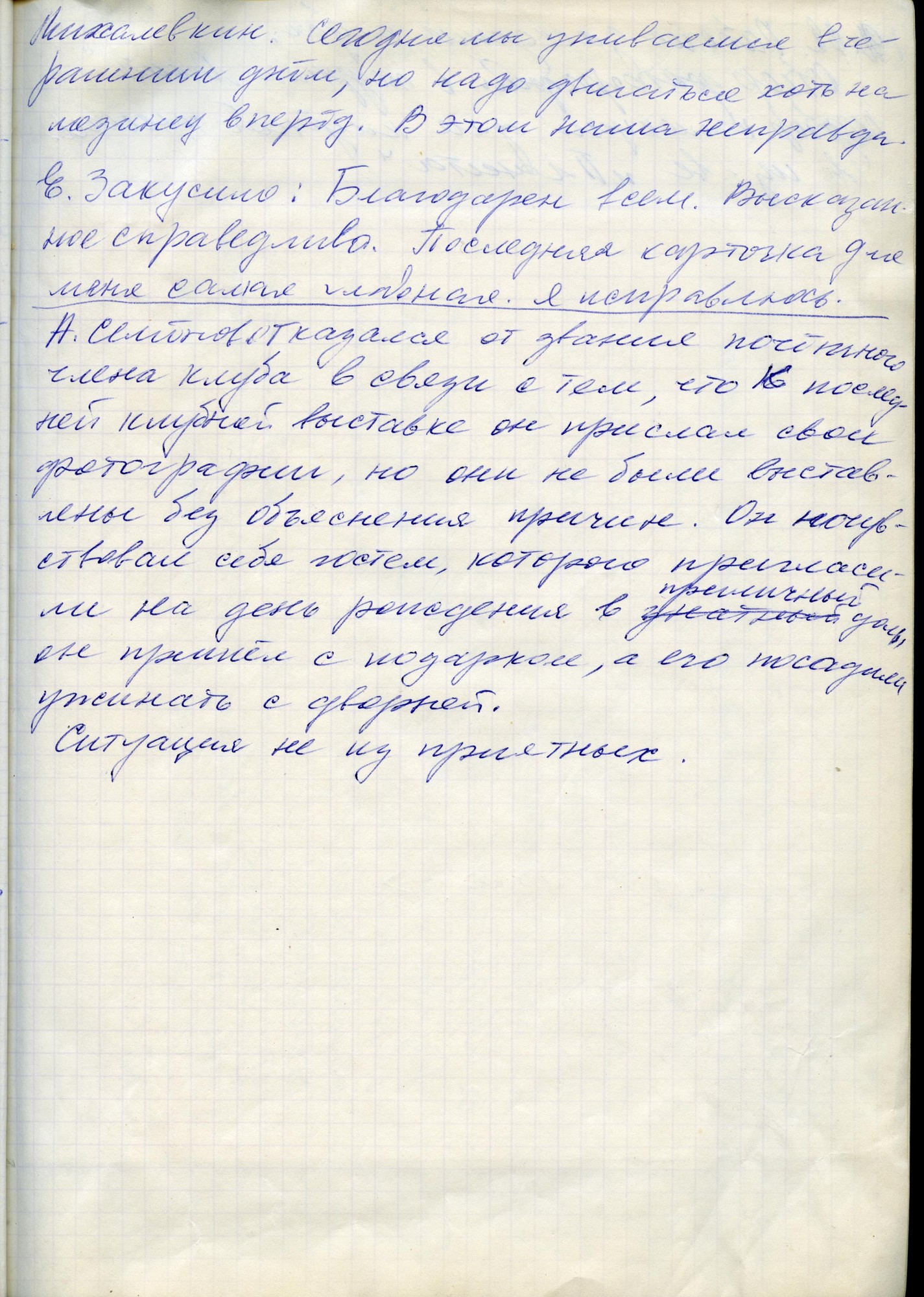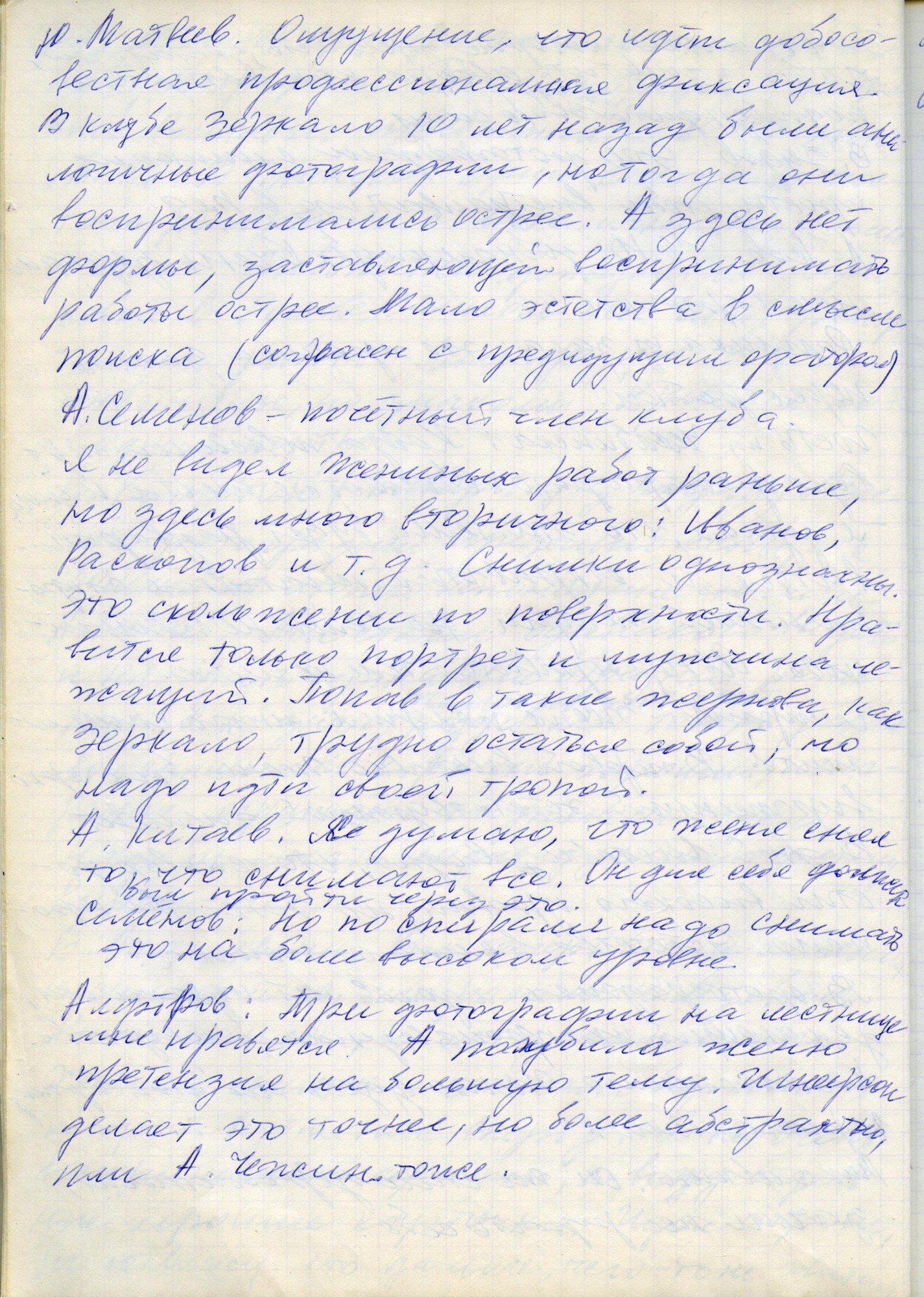 Е. Закусило: Здесь представлены Тува, кусочек Злотого кольца и Ленинграда. В. Зубов (общественный обвинитель): От второй экспозиции осталось впечатление пристрастия к национальной тематике и эстетствующей фотографии. В этот раз осталось пристрастие к жесткой, хорошей фотографии. По композиции построение выставки приближается к группе «Так»: В тувинской серии сочетание чистого репортажа с лаконичной изысканностью. Любопытна дождливая зарисовка в Ростове Великом как чисто репортажная работа. Ленинградские вещи любопытны, но знакомы. Нравится последний портрет. В.Капустин (товарищу из Индии): Еще эти фотографии предельно ясны, а я больше люблю непонятные снимки. А. Китаев: Мы стали одинаково видеть и находить одинаковые образные решения. Я не знаю, посмотрев этот отчет, куда мне теперь девать свои снимки. Но карточки хорошие, интересные, отражают сегодняшний день. Надо бы искать индивидуальную форму выражения. Б. Михалевкин: Мы теперь стали смелыми и снимаем то, чего раньше нельзя было. Много посылок, но нет законченности. Хороший снимок с человеком без головы, который ведет нас вперед. Я не очень воспринимаю сериалы, а вижу отдельные хорошие карточки. Идол хорош, но не вижу, что дальше, чего-то не хватает. 3-4 снимков, которые здесь есть, достаточно, чтобы защитить автора как автора и подтвердить автору свою силу. В. Зубов: Эти фотографии слишком просты, чтобы встраивать их в ряд. А. Усов: Е.Ю. догнал клуб. Очень зеркальные карточки. Реплика из зала: Это хроника застоя перестройки. Гость из Челябинска: Когда повесили первую фотографию: Сбываются мечты Ильича, то думал, что эта тема будет разворачиваться и открываться негативные стороны нашей жизни. Но темы не получилось. Автор нравится тем не менее. Смирнов. Женя получил много комплиментов. В первой выставке Жени был ярко-выраженный эстетствующий элемент. В этой выставке видно, что человек достиг высокого уровня, но эстетство пропало. Эстетство в смысле поиска. В фотографиях идолов нет изюминки, делающей их произведениями искусства. К сожалению, Женю здесь, на мой взгляд, перехвалили. Михалевкин: Он же стал зеркальным, зачем же ругать себя. Ю. Матвеев: Ощущение, что идет добросовестная профессиональная фиксация. В клубе Зеркало 10 лет назад были аналогичные фотографии, но тогда они воспринимались острее. А здесь нет формы, заставляющей воспринимать работы острее. Мало эстетства в смысле поиска (согласен с предыдущим оратором). А. Семенов – почетный член клуба. Я не видел жениных работ раньше, но здесь много вторичного: Иванов, Раскопов и т.д. Снимки однозначны. Это скольжение по поверхности. Нравится только портрет и мужчина лежащий. Попав в такие жернова, как Зеркало, трудно остаться собой, но надо идти своей тропой. А. Китаев: Я думаю, что Женя снял то, что снимают все. Он для себя должен был пройти через это. Семенов: Но по спирали надо снимать, это на более высоком уровне. Алферов: Три фотографии на лестнице мне нравятся. А погубила Женю претензия на большую тему. Шнеерсон делает это точне, но более абстрактно или А. Чежин тоже. Михалевкин: Сегодня мы упиваемся вчерашним днем, но надо двигаться хоть на мизинец вперед. В этом наша неправда. Е. Закусило: Благодарен всем. Высказанное справедливо. Последняя карточка для меня самая главная. Я исправлюсь. А. Семенов отказался от звания почетного члена к