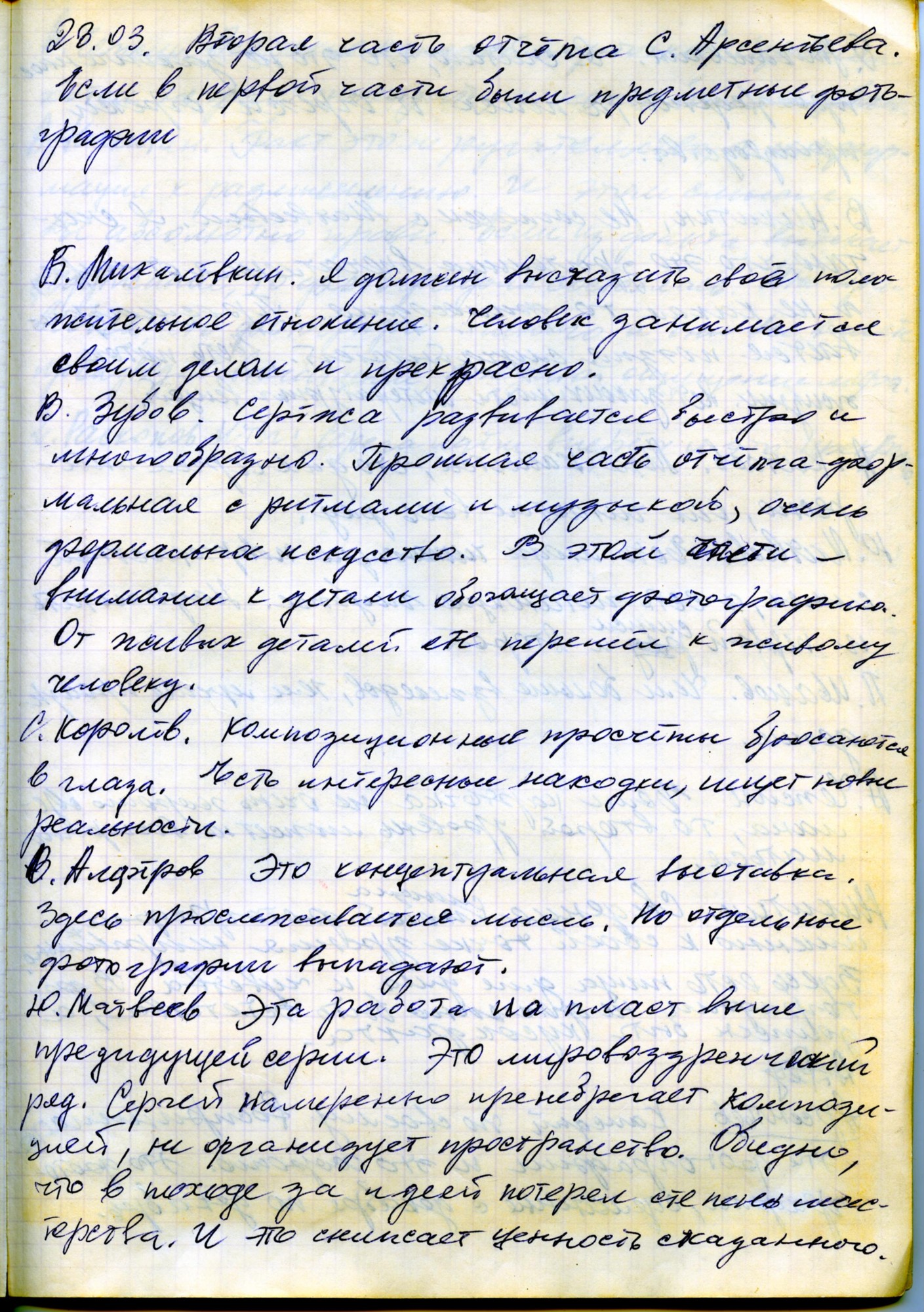 Б. Михалевкин: Я должен высказать свое положительное отношение. Человек занимается своим делом и прекрасно. В. Зубов: Сережа развивается быстро и многообразно. Прошлая часть отчета – формальная с ритмами и музыкой, очень формальное искусство. В этой части – внимание к детали обогащает фотографию. От живых деталей он перешел к живому человеку. С. Королев: Композиционные просчеты бросаются в глаза. Есть интересные находки, ищет новые реальности. В. Алферов: Это концептуальная выставка. Здесь прослеживается мысль. Но отдельные фотографии выпадают. Ю. Матвеев: Эта работа на пласт выше предыдущей. Это мировоззренческий ряд. Сергей намеренно пренебрегает композицией, не организует пространство. Обидно, что в погоне за идеей потерял степень мастерства. И это снижает степень сказанного. Б. Михалевкин: Я считаю, что это не законченное произведение, а поиск и огрехи – огрехи производства. В. Никитин: Не согласен с Матвеевым. Я считаю, что это зрительные впечатления от мира, а не какая-то философия. Просматривается поэзия случайностей. Есть поток жизни. Нет законченности литературных вещей. А. Китаев: Мне кажется, для Сергея интересно, как читается весь ряд. Ю. Матвеев: Есть люди, читающие поверхностный смысл, а есть читающие глубже. Надо читать и первый смысл, и второй. П. Иванов: Чем больше взглядов, тем лучше произведение. А. Чежин: Если карточка не очень хорошо сделана, то второй уровень может не восприниматься. Никитин: Сведение смысла любой фотографии именно к своей точке зрения неправильно. Здесь есть пища для ума и чувства. В фотографии не должно быть эстетства, а должен быть кусок факта. Арсентьев: Каждый по-своему воспринимает эти фотографии и это хорошо. Это фотографии, сделанные с декабря по декабрь. Чежин: Все-таки каждой карточкой Сережа хотел не факт показать, а нечто более глубокое. А. Никитин: Факт – это не ругательство, а информация к размышлению. И в этом смысле вы абсолютно правы. Если из факта вытекает содержание, то фотография состоялась. Мне нравится, что фотографий много и они все вместе производят впечатление, рождают ощущение мира. Е. Раскопов: Серега идет вперед и это прекрасно!