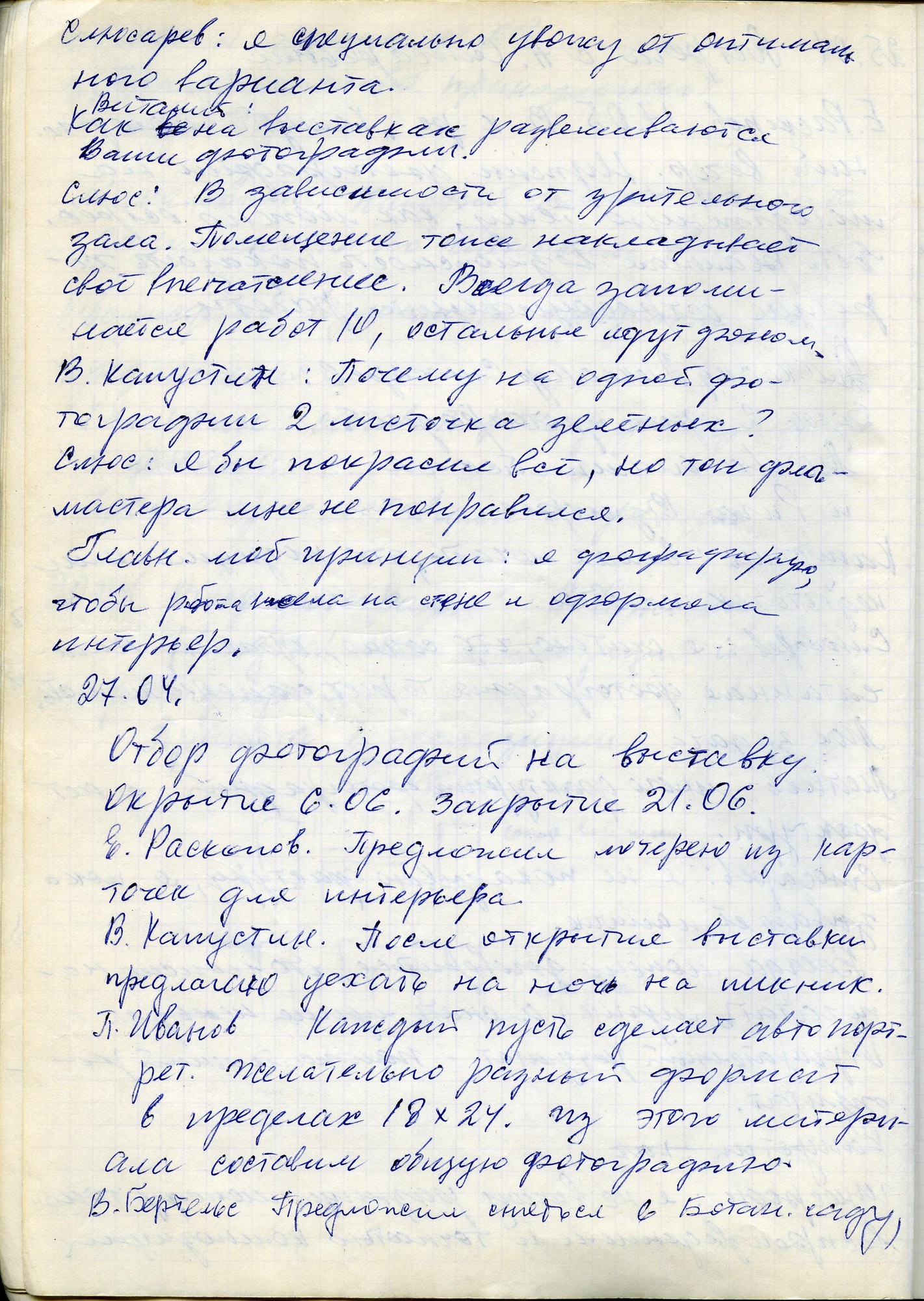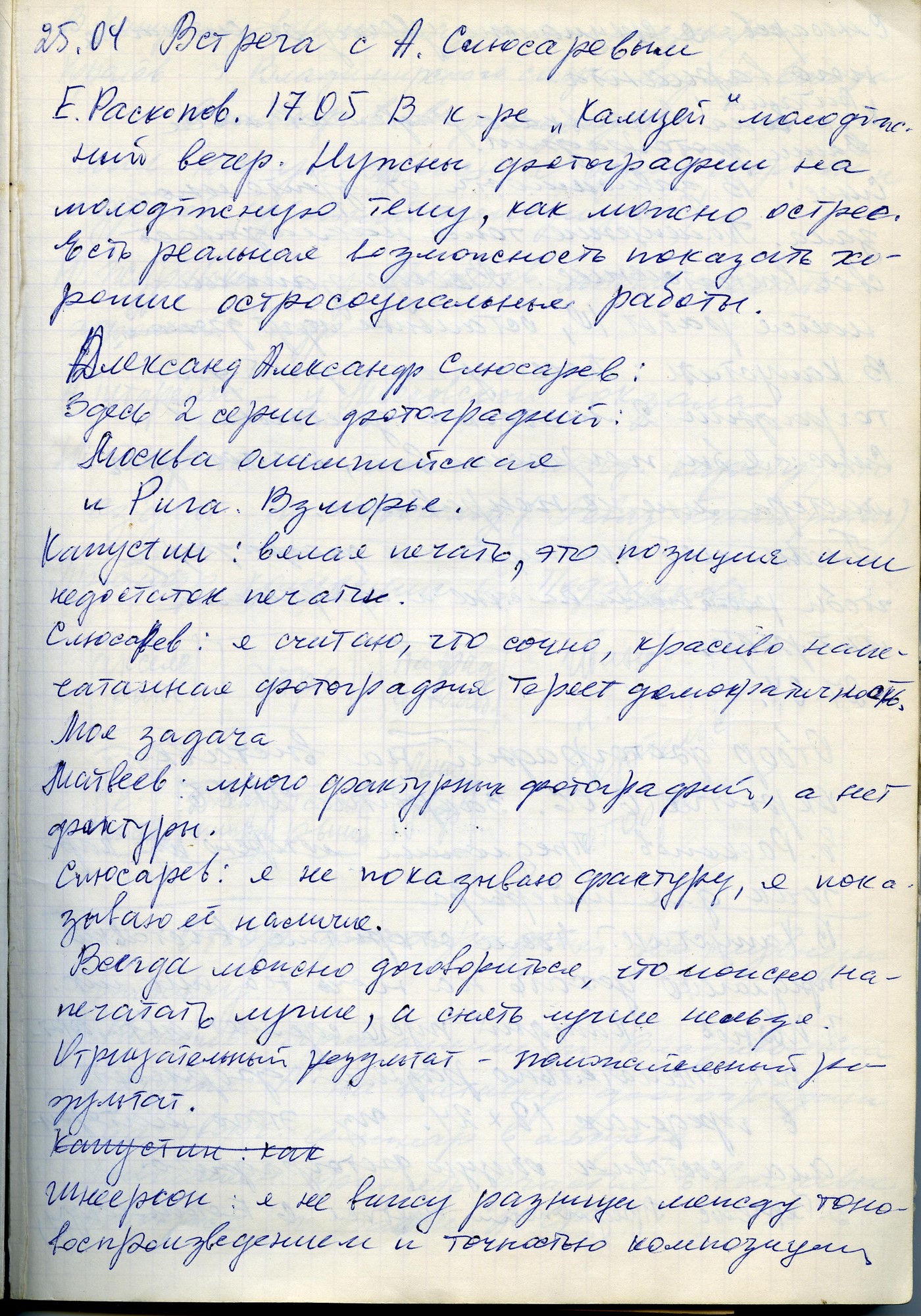 Александр Александрович Слюсарев: Здесь 2 серии фотографий: Москва олимпийская И Рига. Взморье Капустин: Вялая печать, это позиция или недостаток печати? Слюсарев: Я считаю, что сочно, красиво напечатанная фотография теряет демократичность. Моя задача. Матвеев: Много фактурных фотографий, а нет фактуры. Слюсарев: Я не показываю фактуру, я показываю ее наличие. Всегда можно договориться, что можно напечатать лучше, а снять лучше нельзя. Отрицательный результат – положительный результат. Шнеерсон: Я не вижу разницы между тоновосприятием и точностью композиции. Слюсарев: Я специально увожу от оптимального варианта. Виталий: Как на выставке развешиваются ваши фотографии. Слюсарев: В зависимости от зрительного зала. Помещение тоже накладывает свое впечатление. Всегда запоминается работ 10, остальные идут фоном. В. Капустин: Почему на одной фотографии два листочка зеленых? Слюсарев: Я бы покрасил все, но тон фломастера мне не понравился. Главный мой принцип: я фотографирую, чтобы работа жила на стене и оформляла интерьер.
