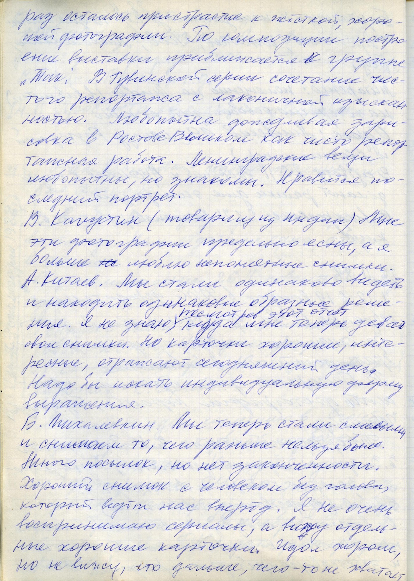 Е.Ниязов: о социальной фотографии, о том, что нельзя переходить грань, когда снимаешь отрицательное, что всякая фотография социальна: о том, что фотографию делает нюанс, что трудно уловить грань между образностью и публицистикой. Виталик: Чувствуется разница между учеником и учителем. Здесь очень тонкая и труднопонимаемая поэзия, зрелые мысли и чувства, лучше чем ученик, чувствует людей. У него все тоньше и легче, чем у Игоря. А. Гезенцвей: Мне это очень нравится. Пейзаж просто прелесть. Портреты замечательны тем, что здесь нет носителей положительных черт. Изъян их в том, что они все статичны. Искусственный свет поставлен плохо. Вся коллекция очень спокойна, не вызывает никакой агрессии. Ю. Матвеев: Автор исповедует красоту со знаком плюс. Для меня, исповедующего красоту со знаком «-», они ничем не дополняют. Нравятся фотографии, где сюжет со знаком «-» выглядит как «+». Д. Шнеерсон: Когда снимаешь портрет, всегда отчасти снимаешь себя. И от этого невозможно отречься. Королев: Чистое созерцание, которое было в предыдущих коллекциях, здесь тоже присутствует. Портреты нравятся. Здесь почти нет плоскостных решений, все они с пространством. Чежин: Меня не удовлетворяет кадрировка. «Цветение» похоже на серию Ракаускаса, поэтому эта серия смотрится как вторичная.