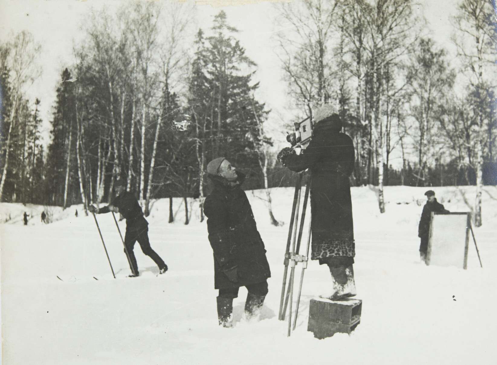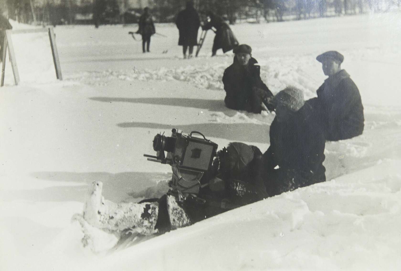 Рабочий момент съемок фильма «Лыжи». В центре — Георгий Максимов, 1932
