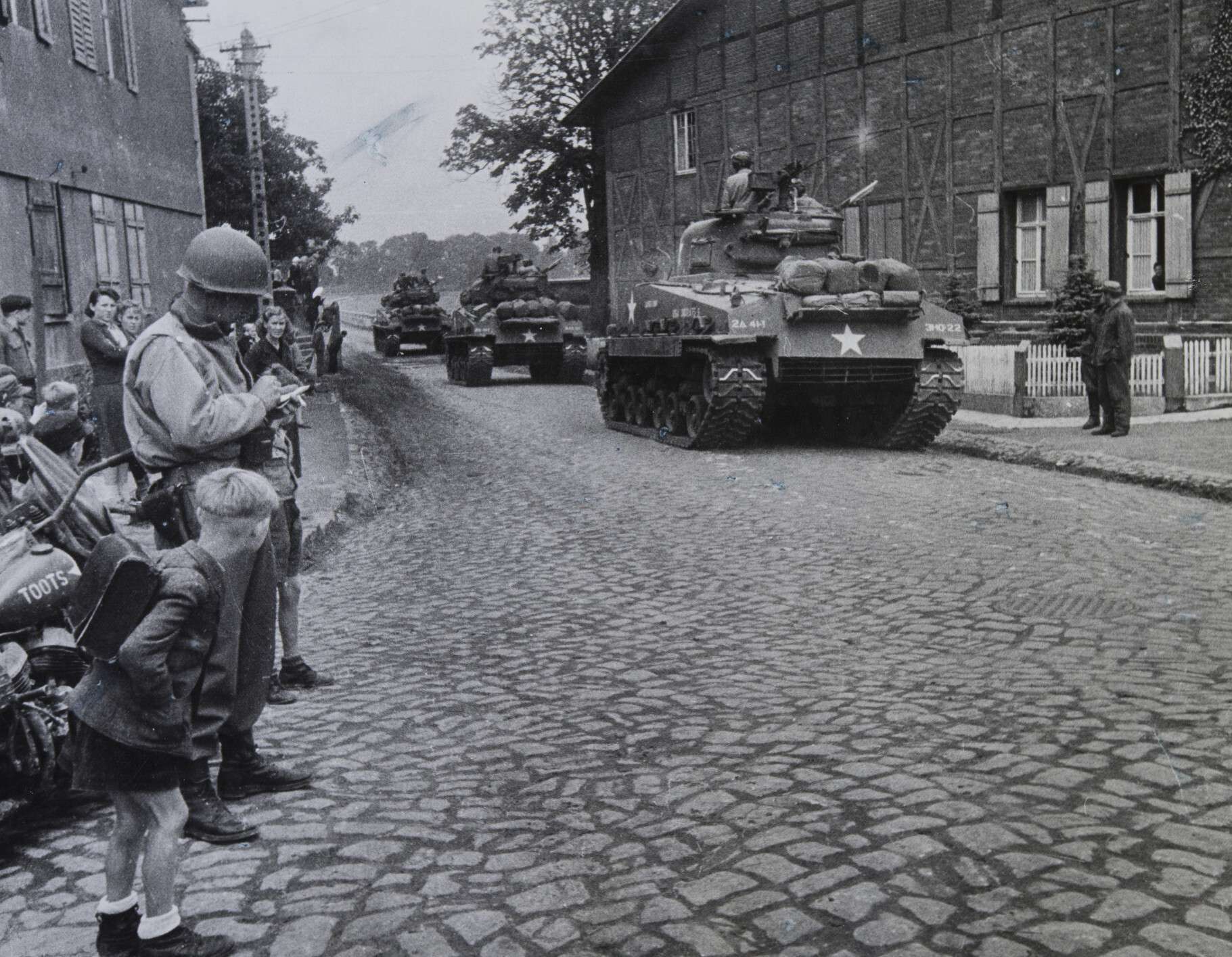 Смело шли танки, сокрушая врага огнем, броней и гусеницами. На виду у нас пылали вражеские боевые машины и другая техника. Враг оказывал упорное сопротивление. Отдельные группы гитлеровцев сдавались в плен, видимо, они никак не могли сообразить, что же случилось, кто наступает. Американцы? Но почему же тогда они бьют «по-русски»? Через 30-35 мин. к нам на КП на бронетранспортере подъехал помощник начальника связи 10-го гвардейского танкового корпуса майор И. Л. Андреенко и доставил ценные сведения о противнике. Но как только он отъехал, шальной снаряд сразил его вместе с командиром взвода П. А. Егоровым. Мы очень сожалели об их безвременной гибели.