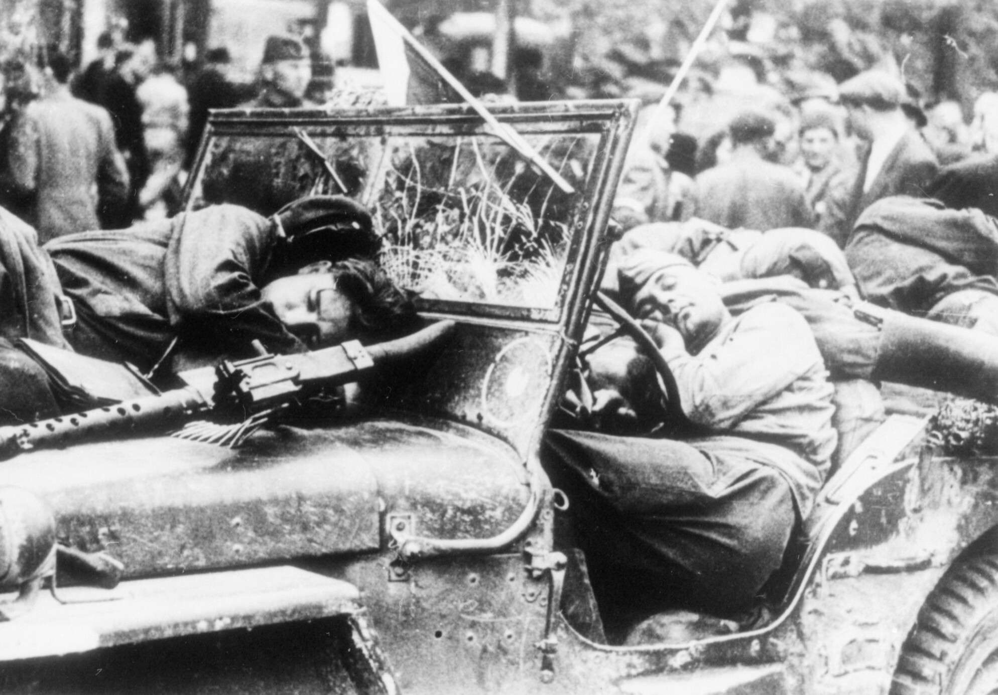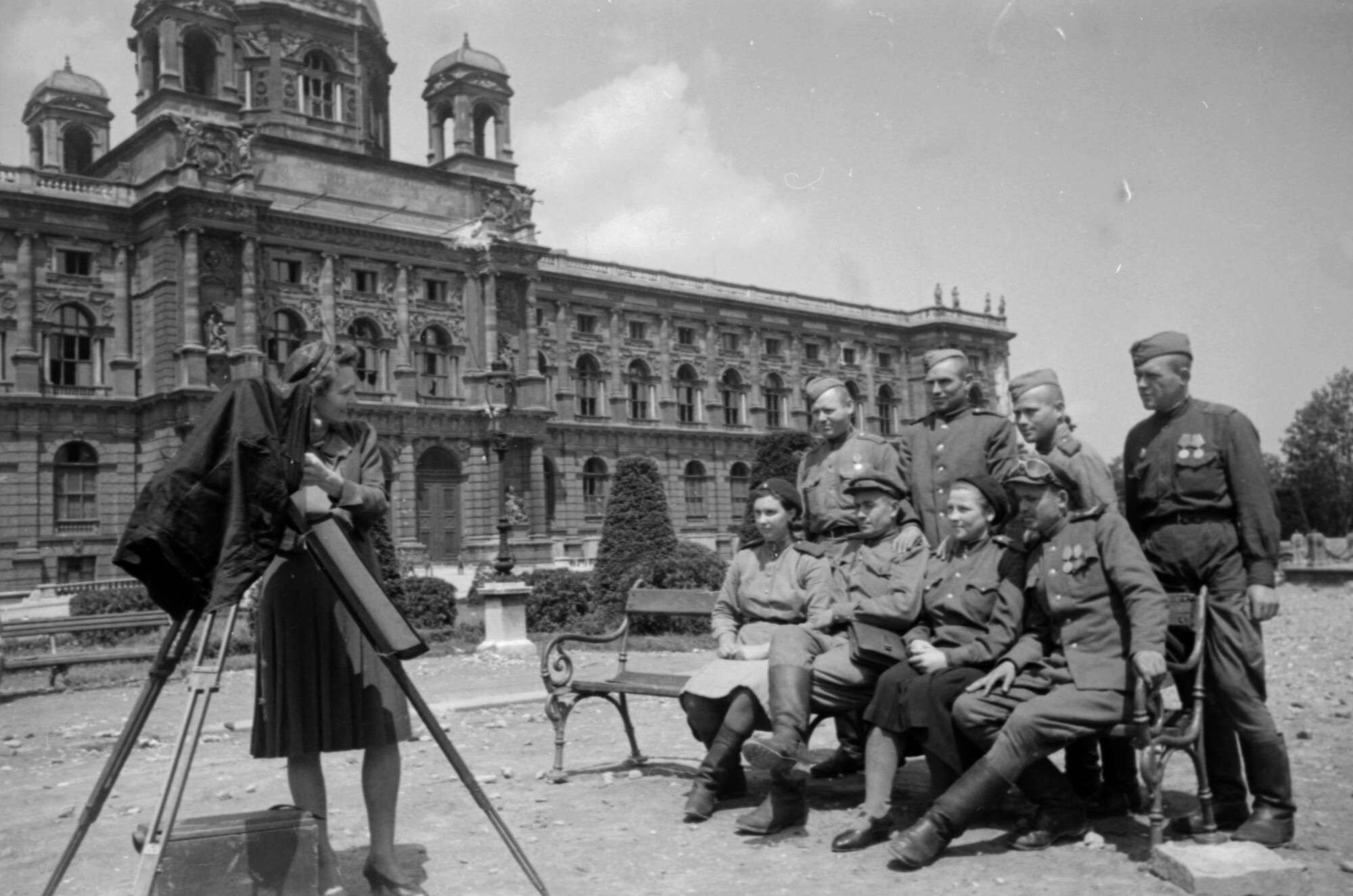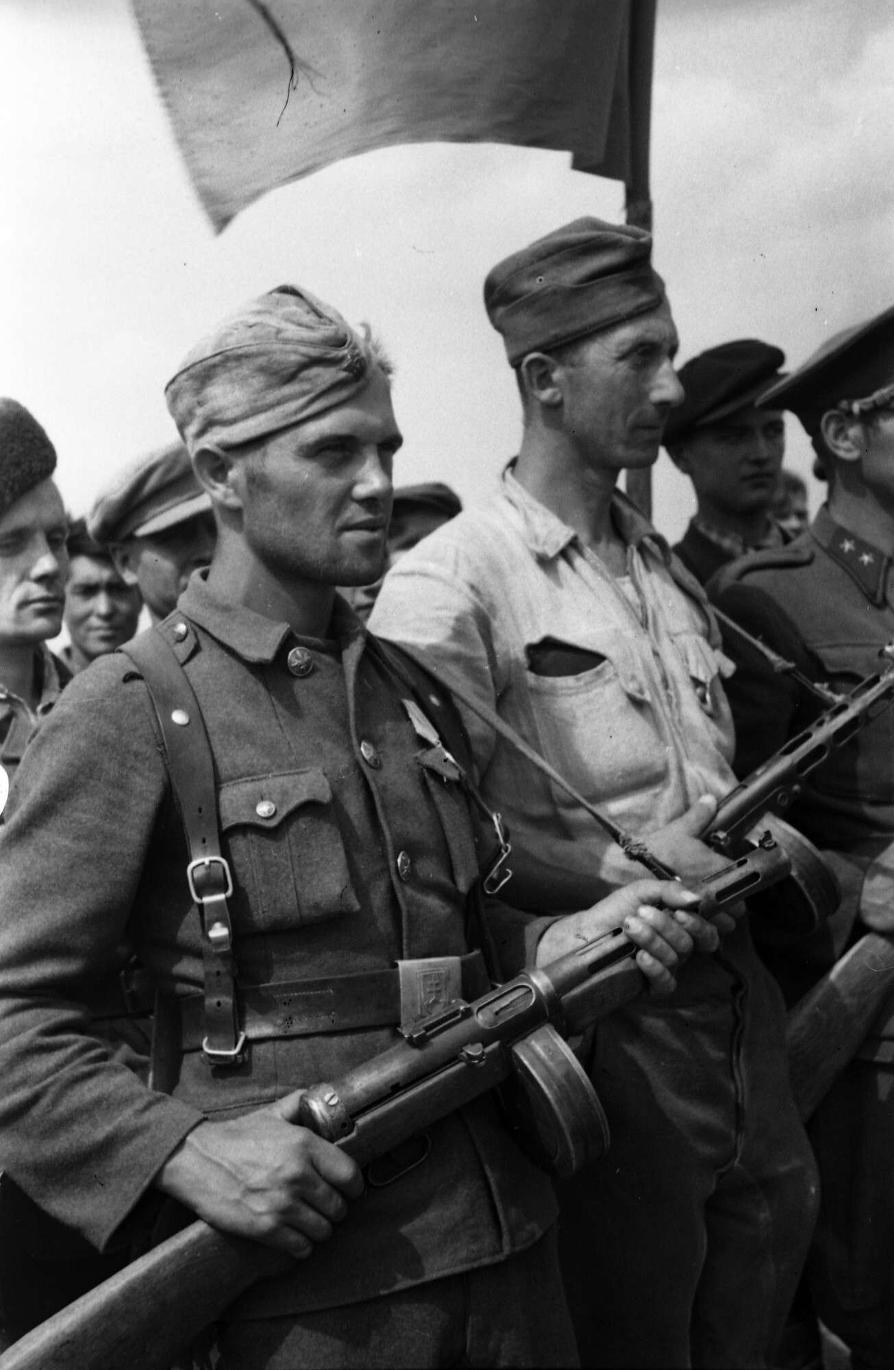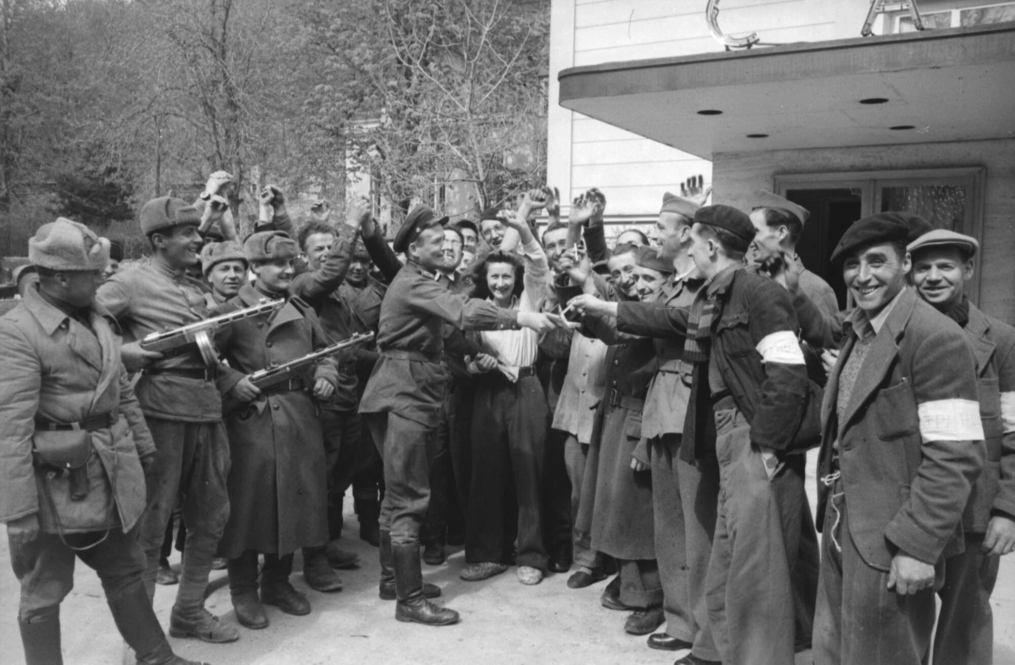 Советская девушка-боец и югославские солдаты