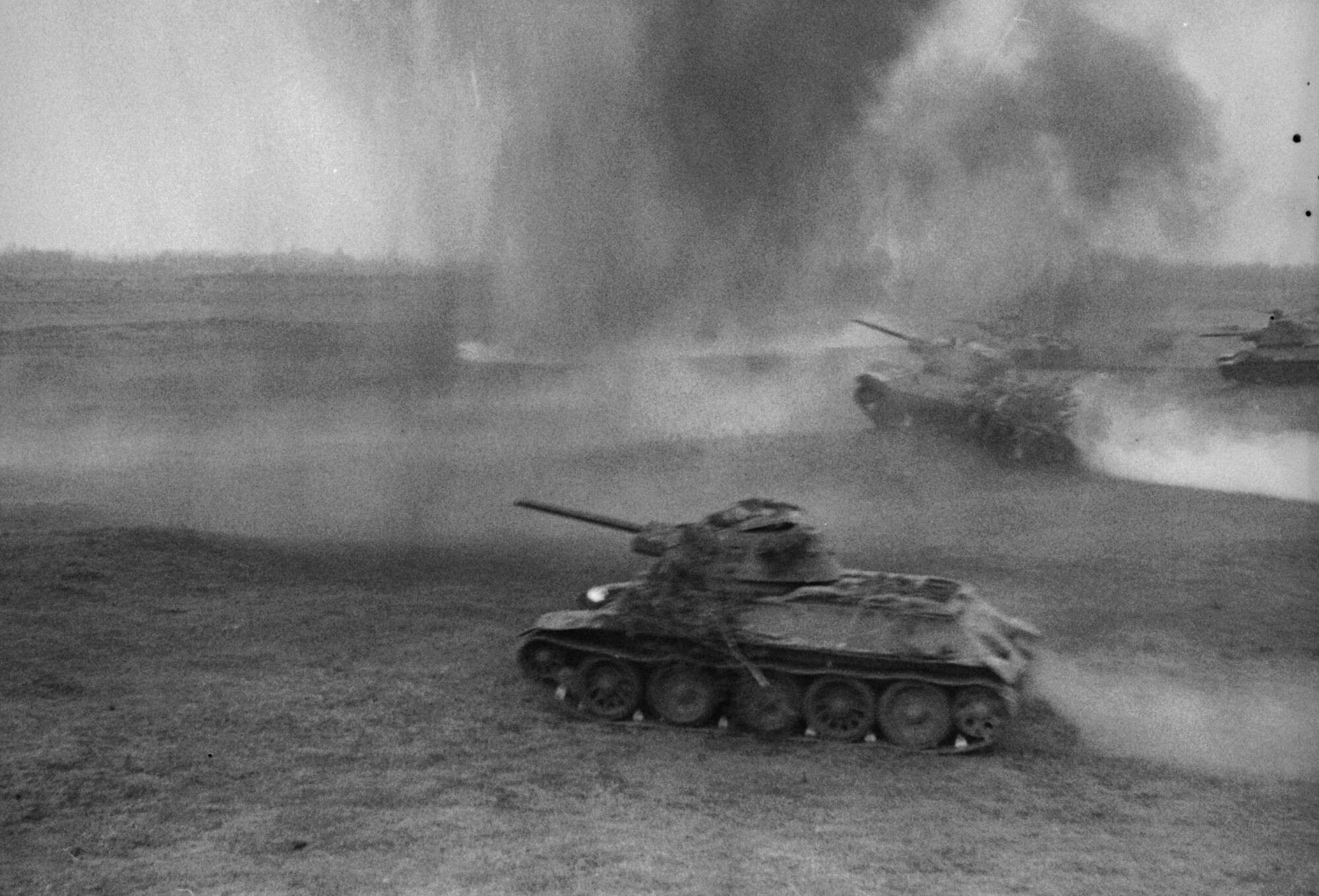 В 8 час. утра 6 мая мы находились у себя на наблюдательном пункте. В 8 час. 30 мин. после короткого артиллерийского налета передовые отряды начали атаку. Мы наблюдали, как наши танки (их в обоих передовых отрядах насчитывалось около 150) построились в боевой порядок — углом вперед. Такой порядок построения выгоден в случае внезапного противотанкового огня противника и при наличии минных полей. К тому же такое построение обеспечивало эффективное ведение огня, как фронтального, так и флангового, тогда как боевой порядок в линию позволял вести огонь по существу только перед фронтом и не гарантировал от внезапных сюрпризов.