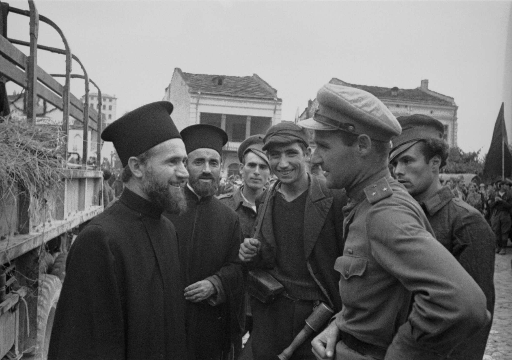 Советский лейтенант беседует с группой болгарских партизан и представителями духовенства
