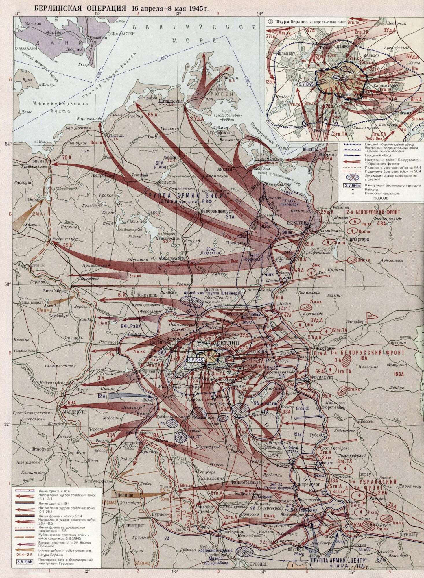 Одной из последних наступательных операций советских войск стала Берлинская операция, в рамках которой были так же проведены Штеттинско-Ростокская, Зееловско-Берлинская, Котбус-Потсдамская, Шпремберг-Торгауская и Бранденбурго-Ретеновская фронтовые операции силами 1-го и 2-го Белорусского и 1-го Украинского фронтов. Взятие столицы Германии входило в задачи 1-го Белорусского фронта под командованием Г.К. Жукова. 25 апреля 1945 года началось наступление на Берлин. 30 апреля советские войска овладели первым этажом Рейхстага, но даже после того, как на Рейхстаге 1 мая был водружен советский флаг, бой продолжался еще сутки. Командующий обороной Берлина генерал Вейдлинг 2 мая сообщил о готовности прекратить сопротивление. Акт о безоговорочной капитуляции Германии был подписан 7 мая в 02:41 по центральноевропейскому времени. Берлинская операция стала крупнейшим сражением в мировой истории. В ней приняли участие около 3,5 млн. человек, 52 тысячи орудий и минометов, 7750 танков и 11 тысяч самолетов.