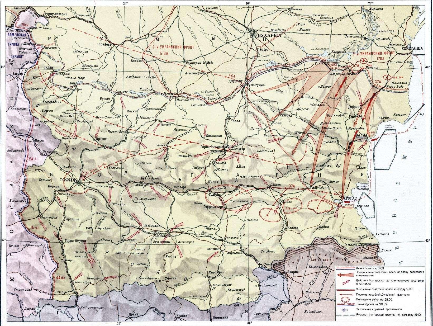 СССР объявила войну Болгарии только 5 сентября 1944 года. Части 3-го Украинского фронта под командованием маршала Ф. Толбухина 8 сентября перешли румыно-болгарскую границу. В Болгарии началось восстание, организованное коммунистами, в ходе которого старое правительство было свергнуто и новое правительство Отечественного фронта объявило войну Германии. Советские войска и войска Народно-освободительной армии Болгарии 15 сентября 1944 вступили в Софию.