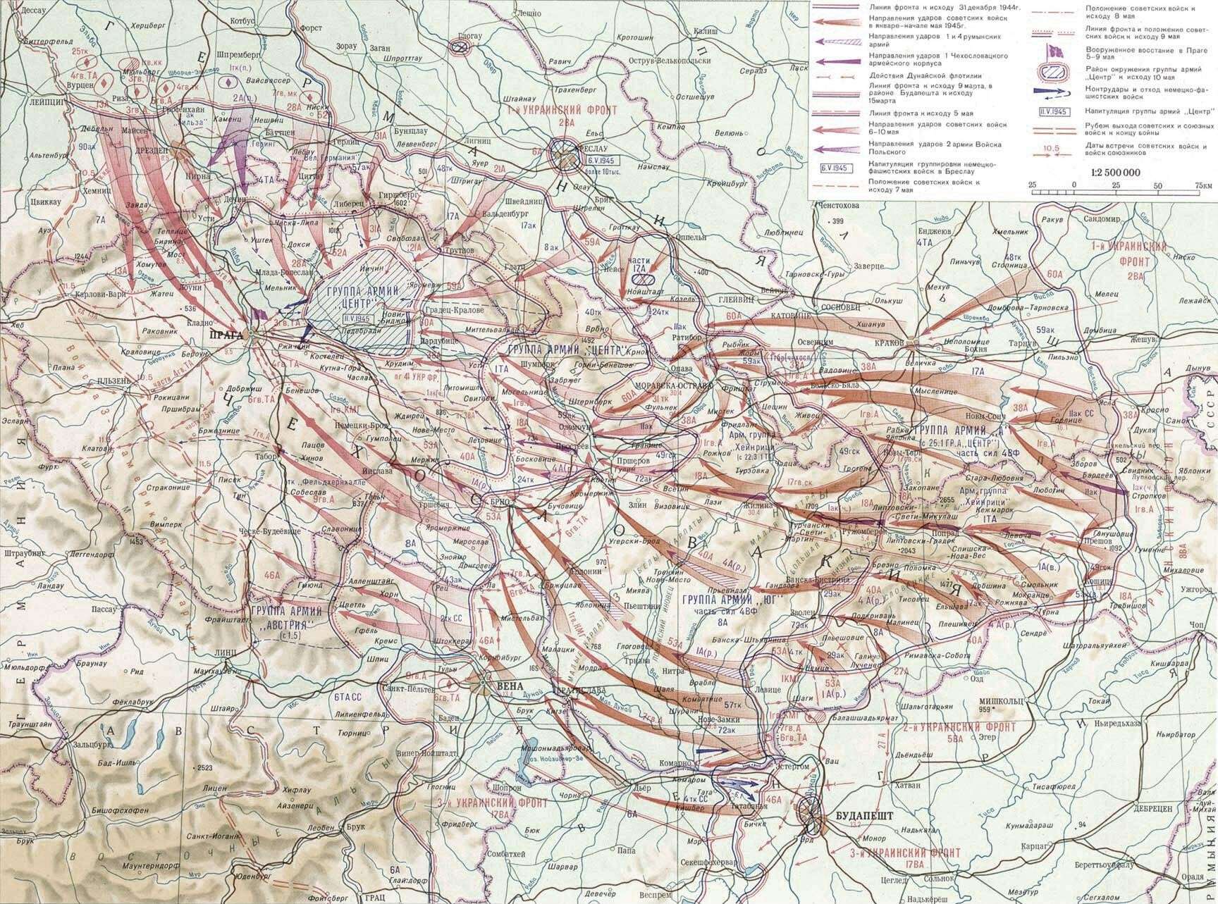 Пражская операция, в результате которой была освобождена Чехословакия, стала последней наступательной операцией красной армии. Операция началась только 6 мая, когда Берлин уже был полностью взят. В период с 5 по 8 мая в Праге началось народное восстание, которые было поддержано 1-й дивизией Комитета освобождения народов России под командованием генерал-майора С. Буняченко. Однако в ночь на 8 мая дивизия покинула Прагу по требованию Чешского национального совета. На следующий день в Прагу вошли советские войска, и наступление продолжилось на запад. В районах городов Ческе-Будеевице и Темниц 10 мая 1945 года красноармейцы встретились с американскими войсками. Хоть операция и завершилась официально 11 мая, но несколько дней еще шли бои. В районе города Пльзень 12 мая был арестован генерал Власов, а 15 мая у города Непомук генерал-майор С. Буняченко. В результате Пражской операции была уничтожена последняя организованная сила Вермахта. Война в Европе была окончена.