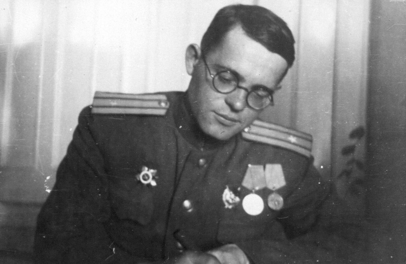 Мы пошли по коридору в те комнаты, откуда было видно, как немцы обстреливают улицу. Видим, напротив, на третьем этаже, приподняты железные занавеси и оттуда бьет ручной пулемет. Мы дали две короткие очереди, и он замолчал. Но тут же немцы к нам через другое окно бросили снизу, с улицы, гранату.