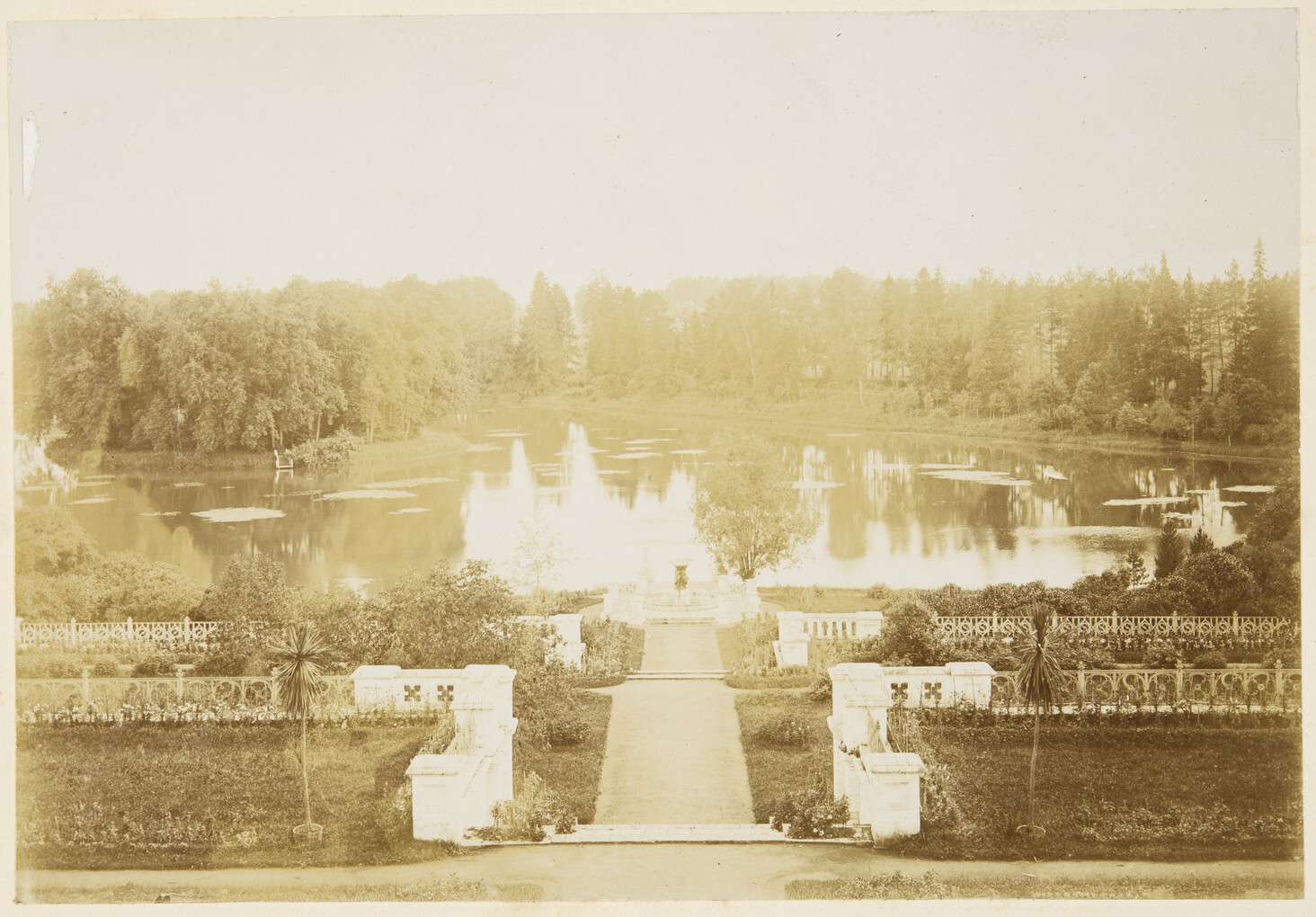 Пейзаж. Марфино. вид на лестницу, фонтан, пруд и пристань со стороны террасы дворца 1880-е